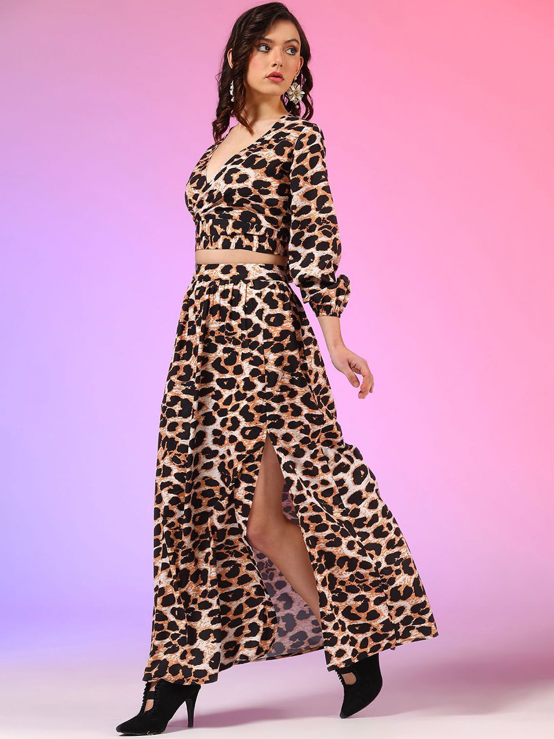 Product Details: This co-ords consists of Top and SkirtBlack, orange & white printed top, has V-neck, long sleeves, full placket closure and regular waist hemBlack, orange & white printed mid-rise skirt, has slip-on closure and flared hem || SIZE & FIT: The model (height 5'8") is wearing a size S || MATERIAL & CARE: PolyesterMachine Wash