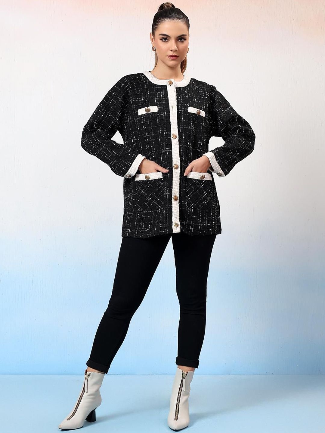 Product Details: Black colored checked single-breasted overcoat, has mandarin collar, long sleeves, button closure, four pockets, a straight hem || SIZE & FIT: The model (height 5'8") is wearing a size S || MATERIAL & CARE: Polyester BlendMachine Wash