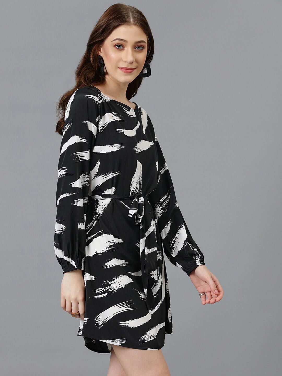 Kotty Black & White Abstract Printed Satin A-Line Dress
