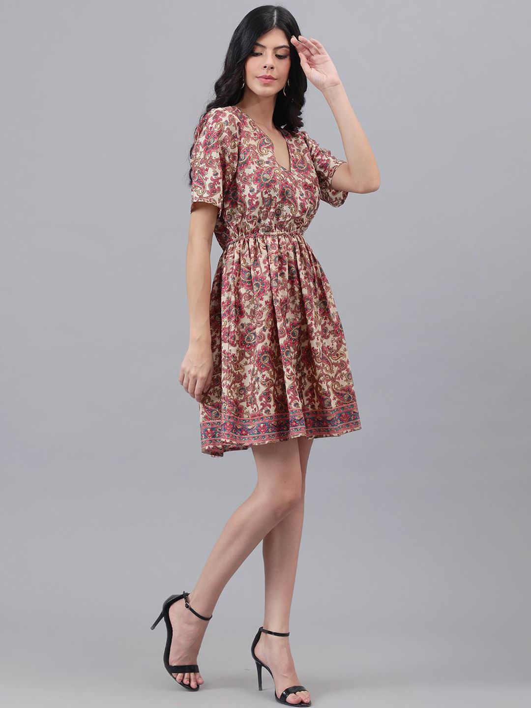 Kotty Brown & Cream Ethnic Motifs Printed Dress