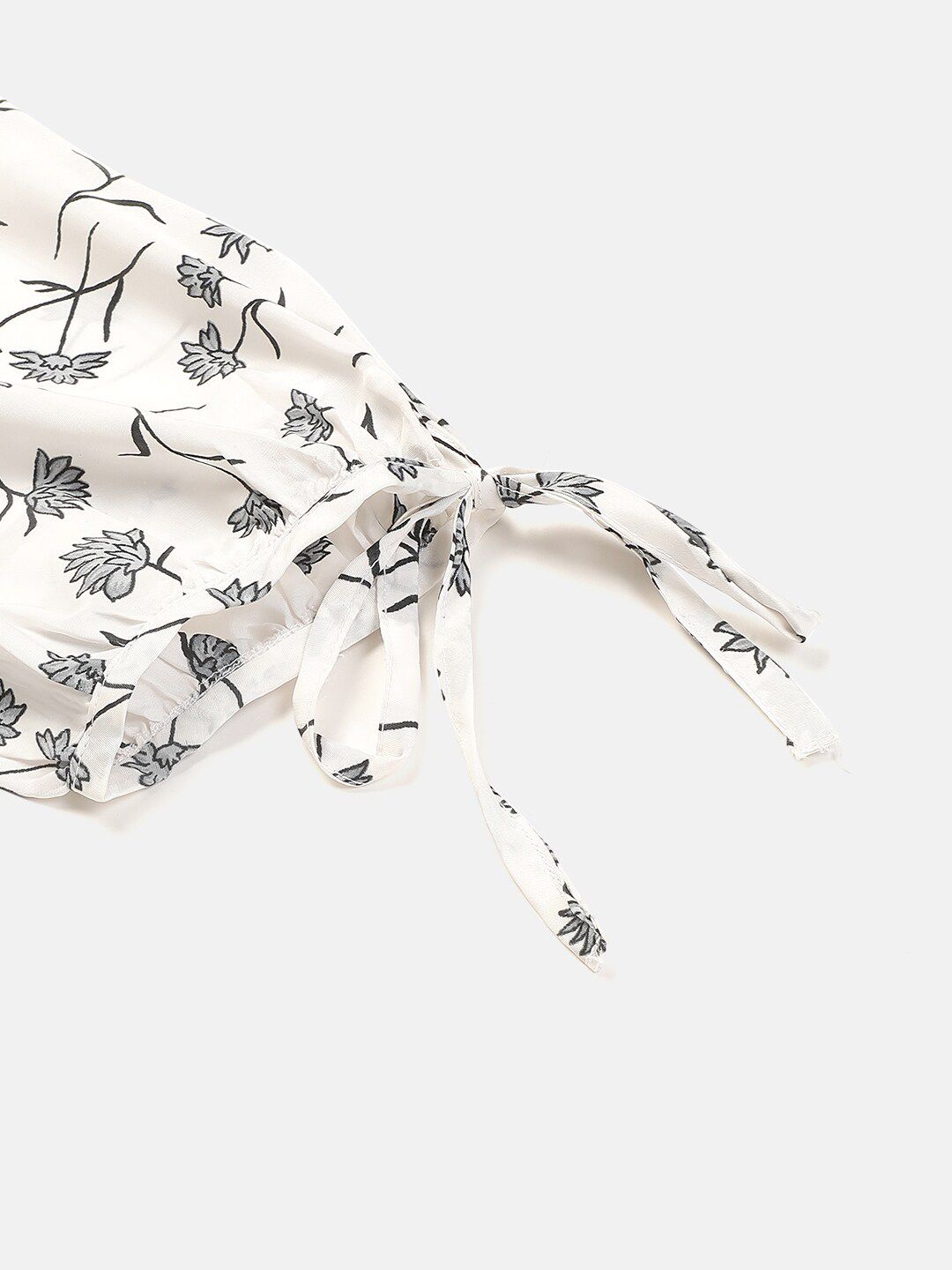 Product Details: White & grey floral print fit & flare dress Round neck Short,puff sleeves Midi length in flared hem || MATERIAL & CARE: PolyesterMachine Wash || SIZE & FIT: The model (height 5'8) is wearing a size S