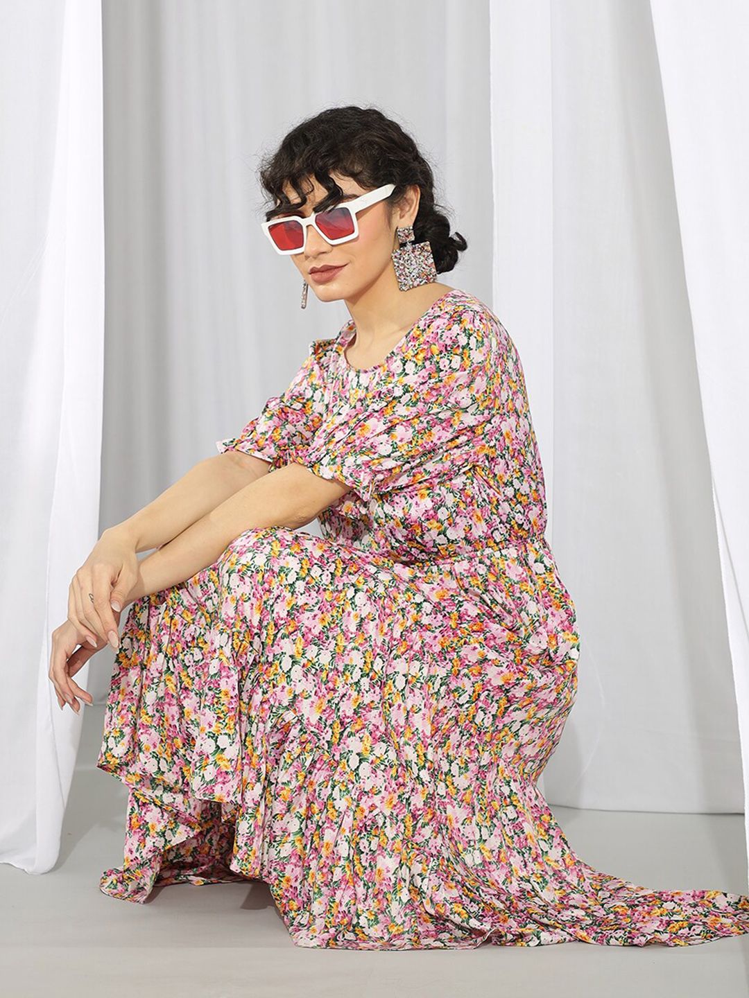 Kotty Pink Floral Printed Flared Sleeves Fit & Flare Midi Dress