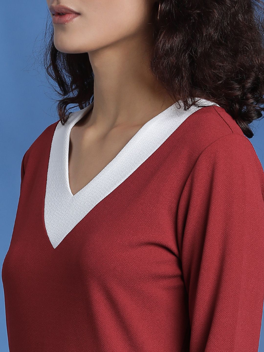 Product Details: Maroon solid a-line dress V-neck Long, regular sleeves Midi length in straight hem || SIZE & FIT: The model (height 5'8) is wearing a size S || MATERIAL & CARE: Viscose rayonMachine wash