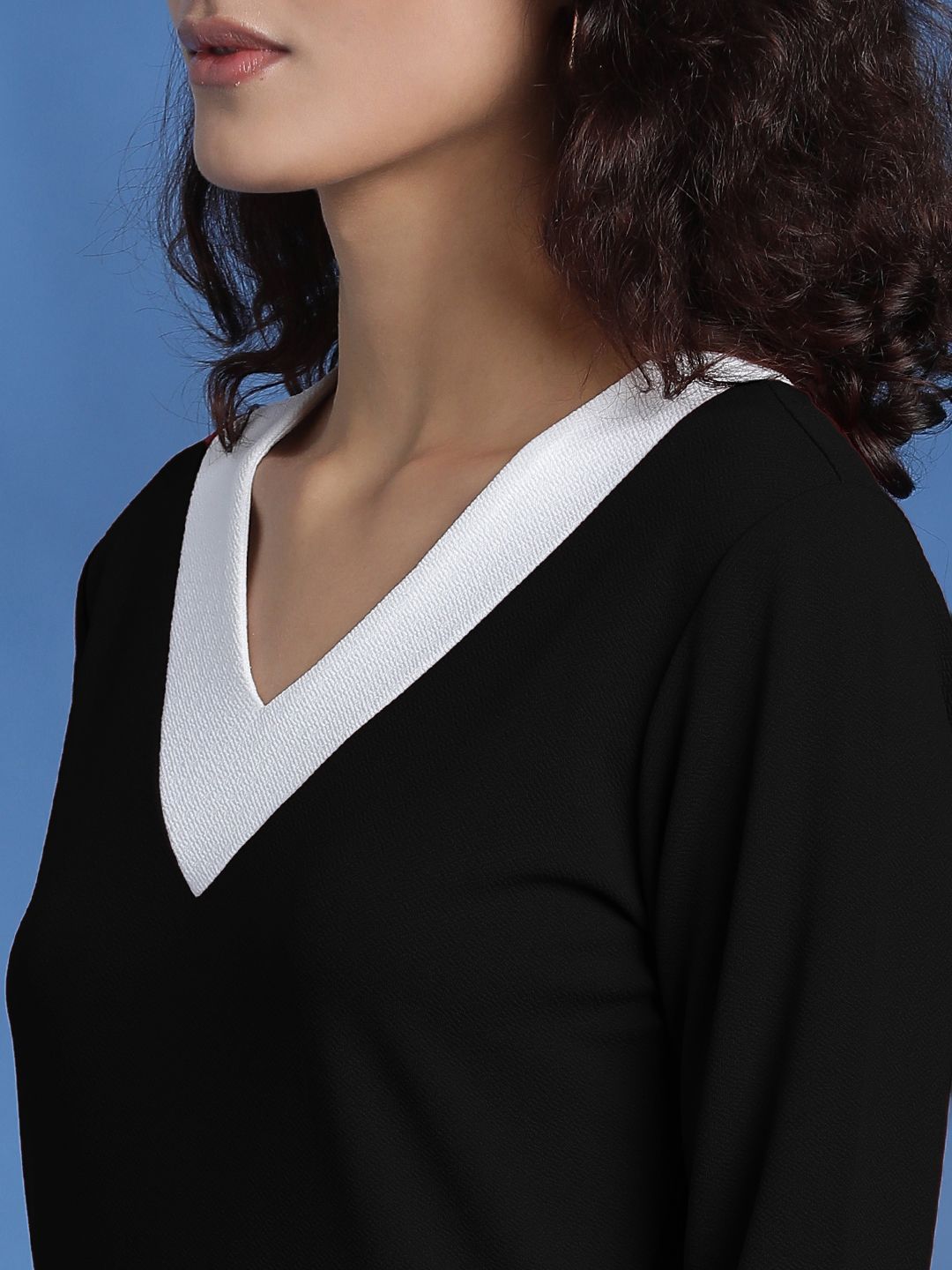 Product Details: Black colourblocked a-line dress V-neck Long, regular sleeves Midi length in straight hem || MATERIAL & CARE: Viscose Rayon Machine wash || SIZE & FIT: The model (height 5'8) is wearing a size S