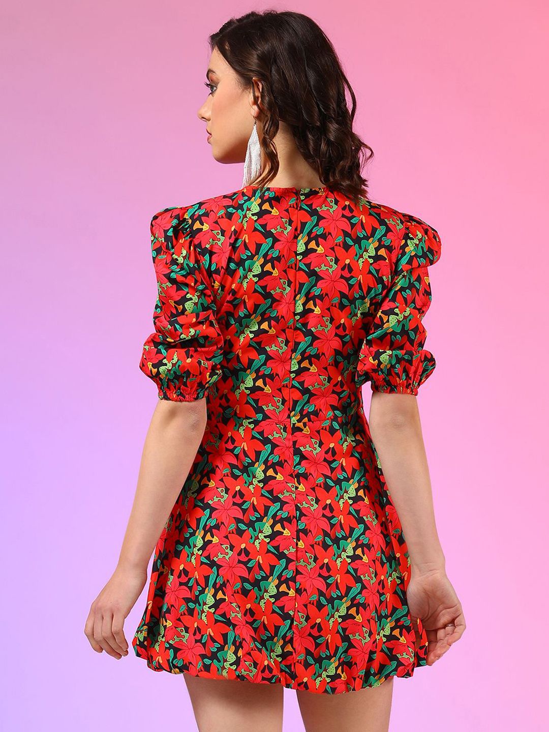 Product Details: Red floral printed fit & flare dress High neck Short, puff sleeve Mini length in flared hem Crepe fabric Concealed zip closure || MATERIAL & CARE: PolyesterMachine wash || SIZE & FIT: The model (height 5'8) is wearing a size S