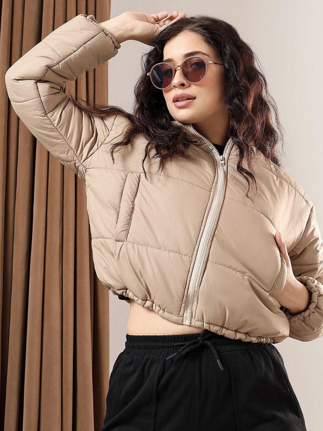 Product Details: Beige casual jacketMock collarPuffer jacketLong sleevesStraight hemlinePolyester lining || MATERIAL & CARE: NylonMachine Wash || SIZE & FIT: The model (height 5.8') is wearing a size S