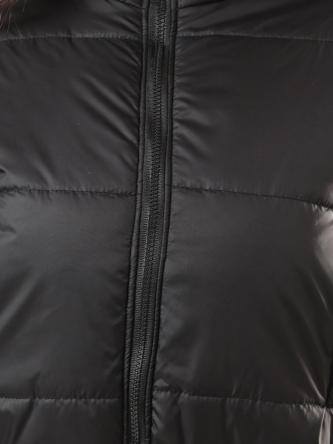 Product Details: Black casual jacketMock collarPuffer jacketLong sleevesStraight hemlinePolyester lining || SIZE & FIT: The model (height 5.8') is wearing a size S || MATERIAL & CARE: NylonMachine Wash