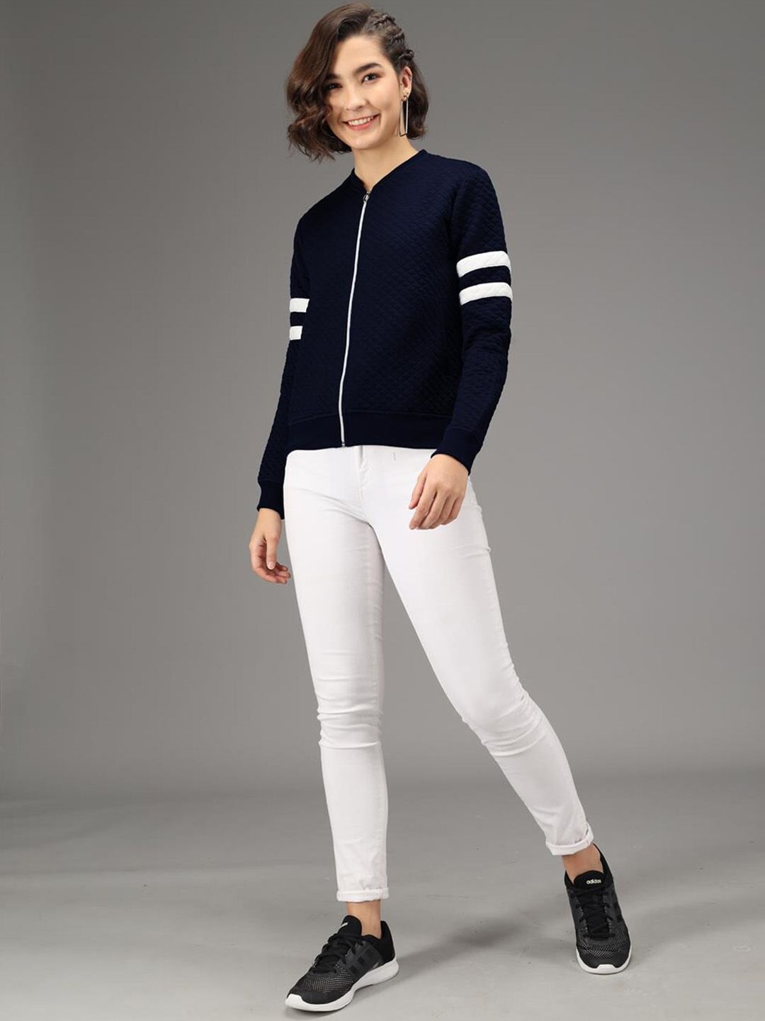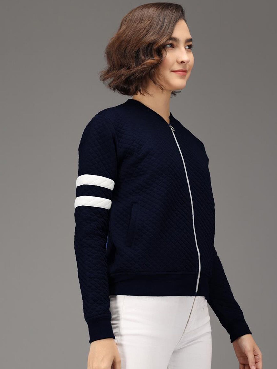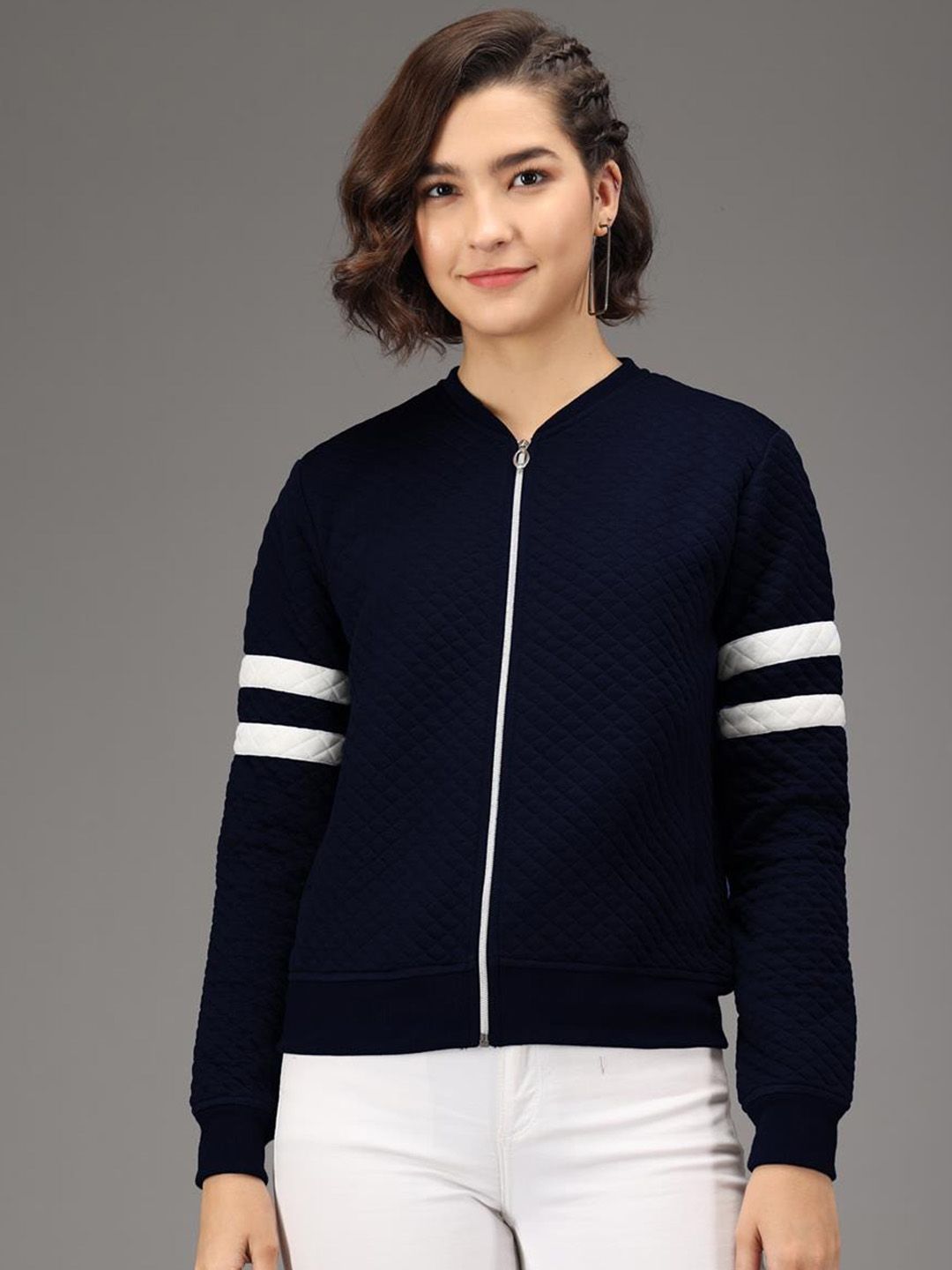 Product Details: Navy blue striped lightweight tailored jacket with zip detail, has a mandarin collar, 2 pockets ,has a button closure, three-quarter sleeves, straight hemline, polyester lining || MATERIAL & CARE: Hand Wash || SIZE & FIT: The model (height 5'8) is wearing a size S