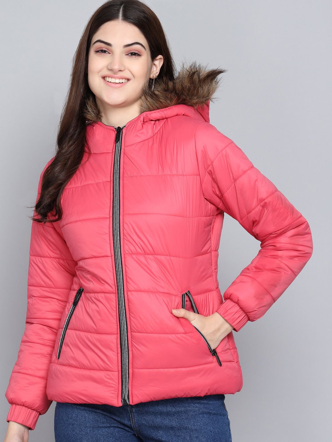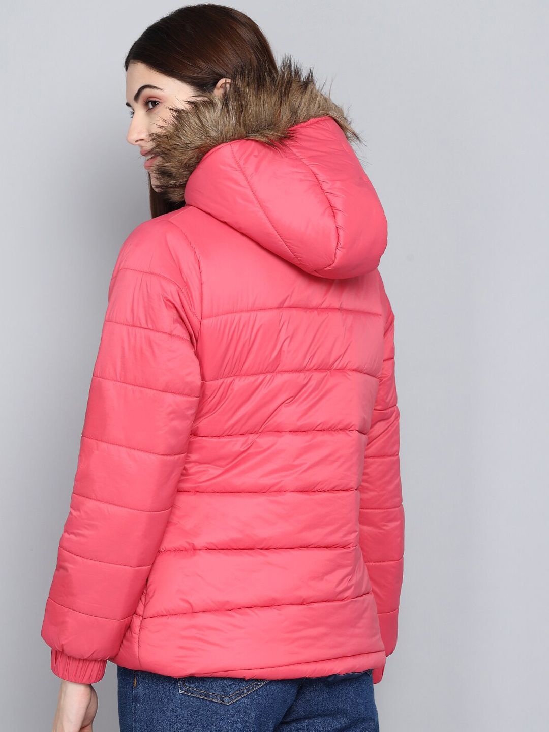 Kotty Women Pink Solid Outdoor Parka Jacket with Faux Fur Trim