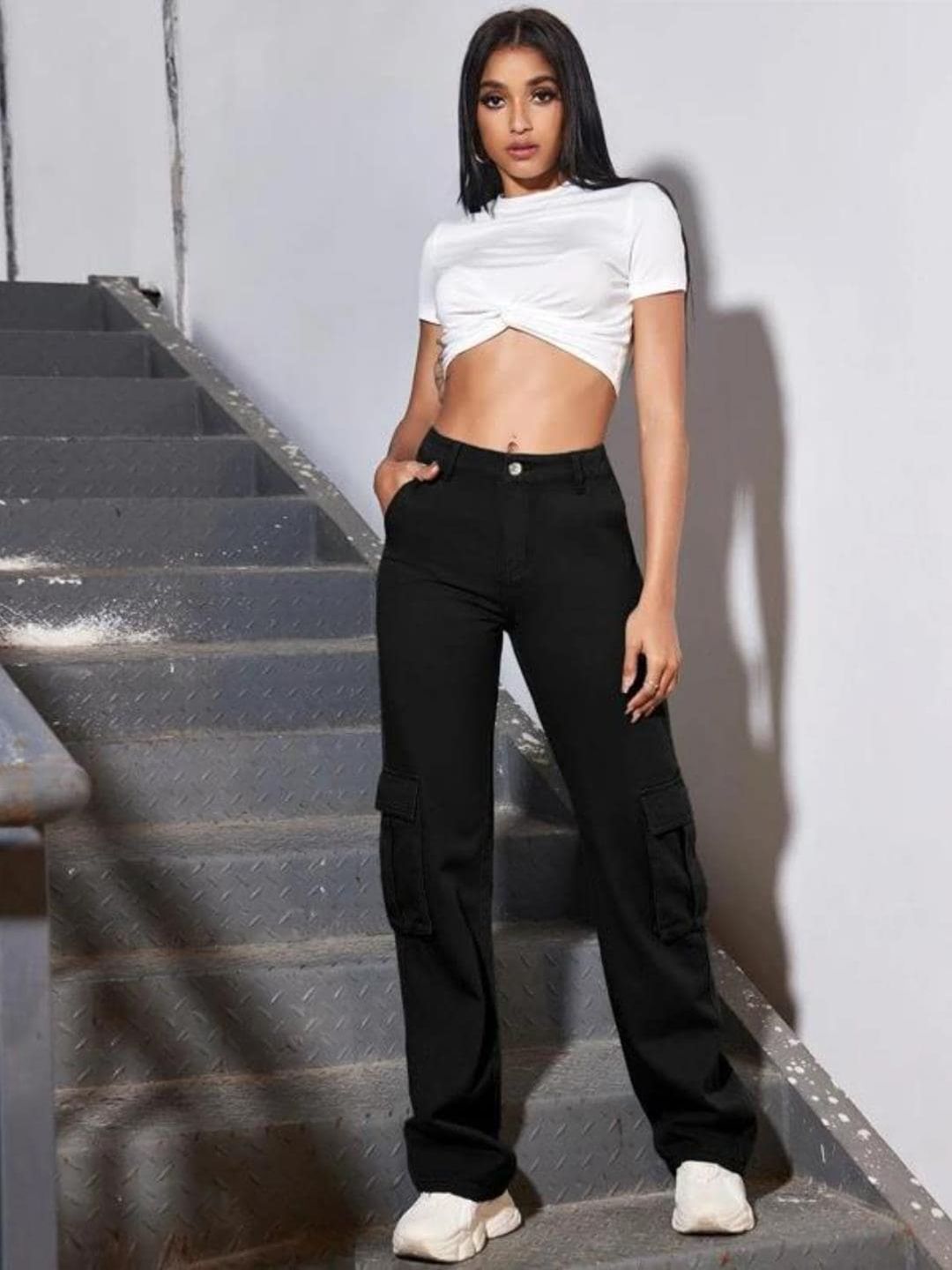 Kotty Women Black Jean Straight Fit High-Rise Clean Look Stretchable Cargo Jeans