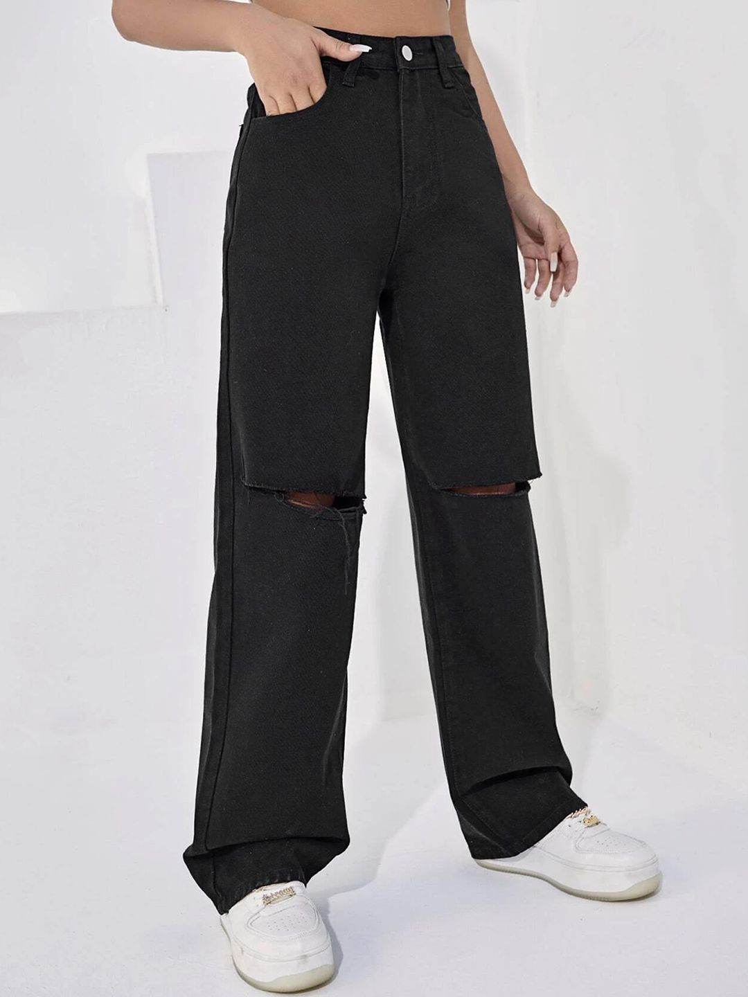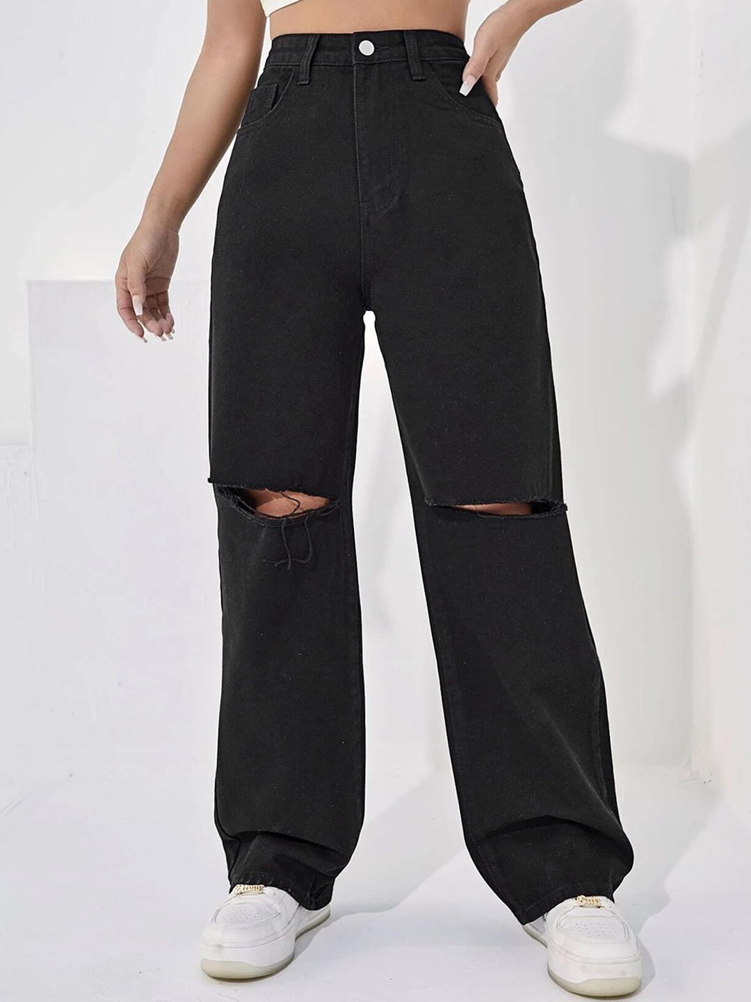 Kotty Women Black Jean Straight Fit High-Rise Slash Knee Stretchable Jeans