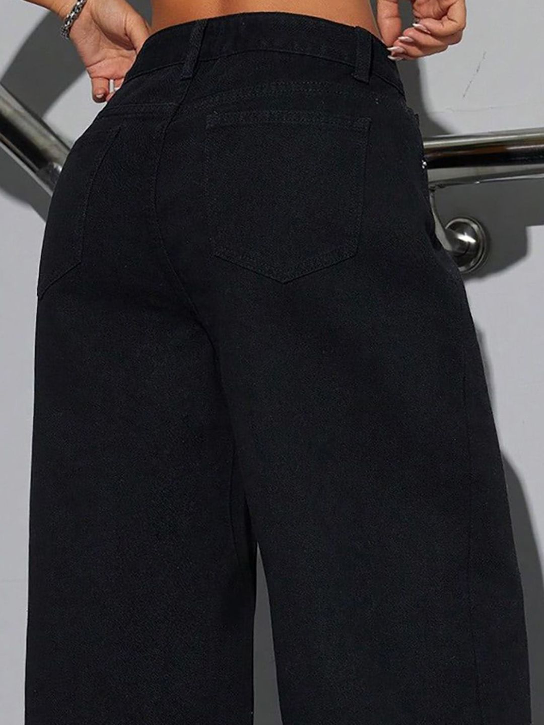 No fade black jeans Wide leg, high-rise Brand Fit: jean Clean look Stretchable 5 pocket Length: regular || MATERIAL & CARE: CottonMachine wash cold with like colors || SIZE & FIT: Brand Fit: Jean Fit: Wide Leg Stretchable The model (height 5'8) is wearing a size 28