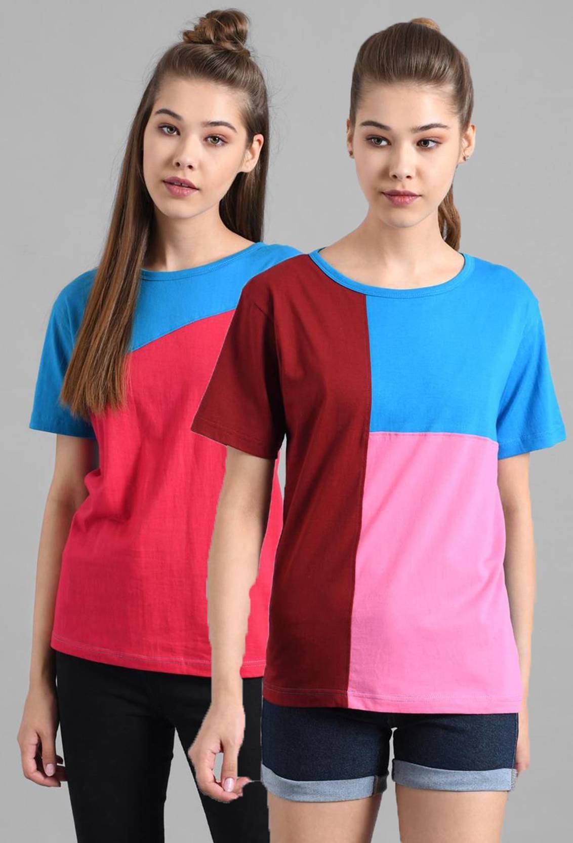kotty Pack of 2 Women Colorblock Round Neck Cotton Blend Multicolor T-Shirt