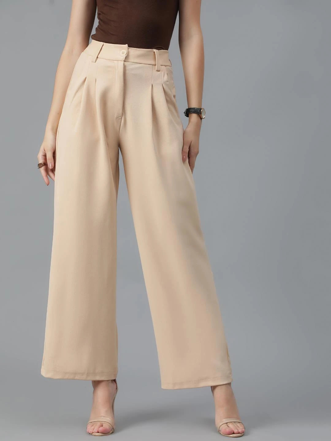Pamper yourself with a stylish comfort in this cool pair of beige pleated pants from the latest collection of Kotty. Well crafted in premium viscose rayon for unmatched drape complemented by fine softness and a smooth touch for ease of wear, these are tailored in a stylishly designed straight fit, cross pocket, button closure with a high-rise silhouette to compliment your contours. Pair them with a contrast top for an alluring combination.Kindly ensure the size chart before buying.