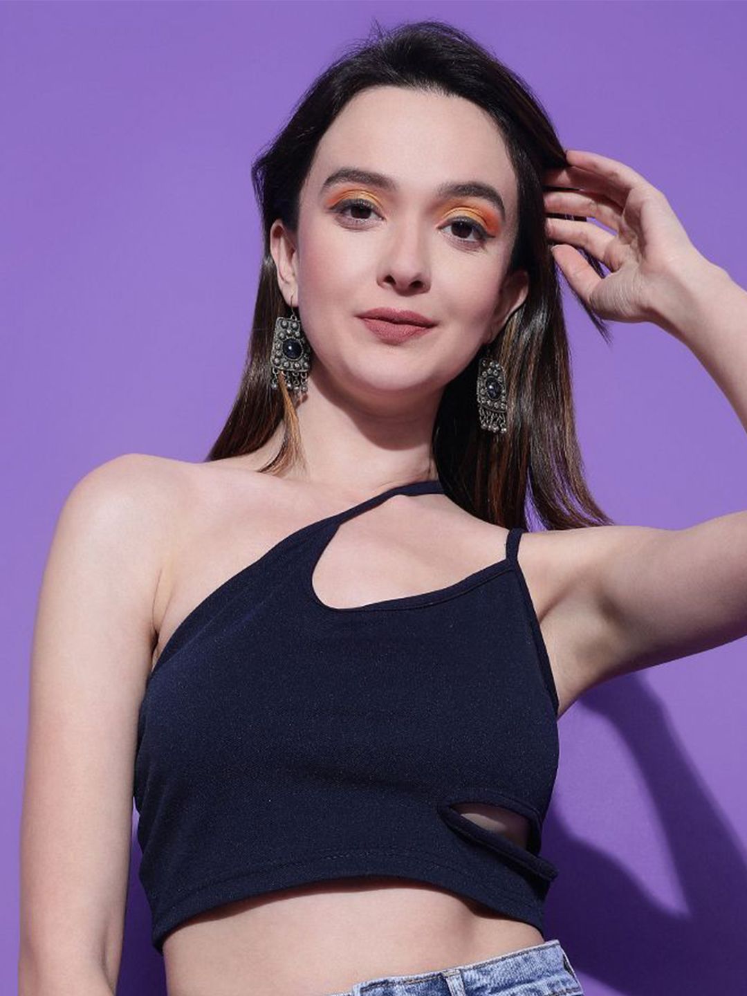 Product Details: Navy blue Top for womenSolidCrop lengthOne shoulderSleevelessWoven || SIZE & FIT: The model (height 5.8') is wearing a size S || MATERIAL & CARE: PolyesterMachine Wash
