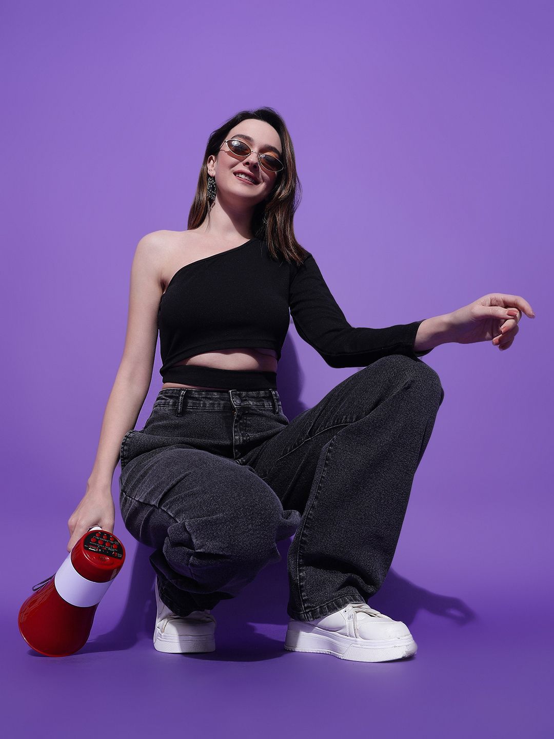 Product Details: Black Top for womenSolidCrop lengthOne shoulderLong sleevesWoven || SIZE & FIT: The model (height 5.8') is wearing a size S || MATERIAL & CARE: PolyesterMachine Wash