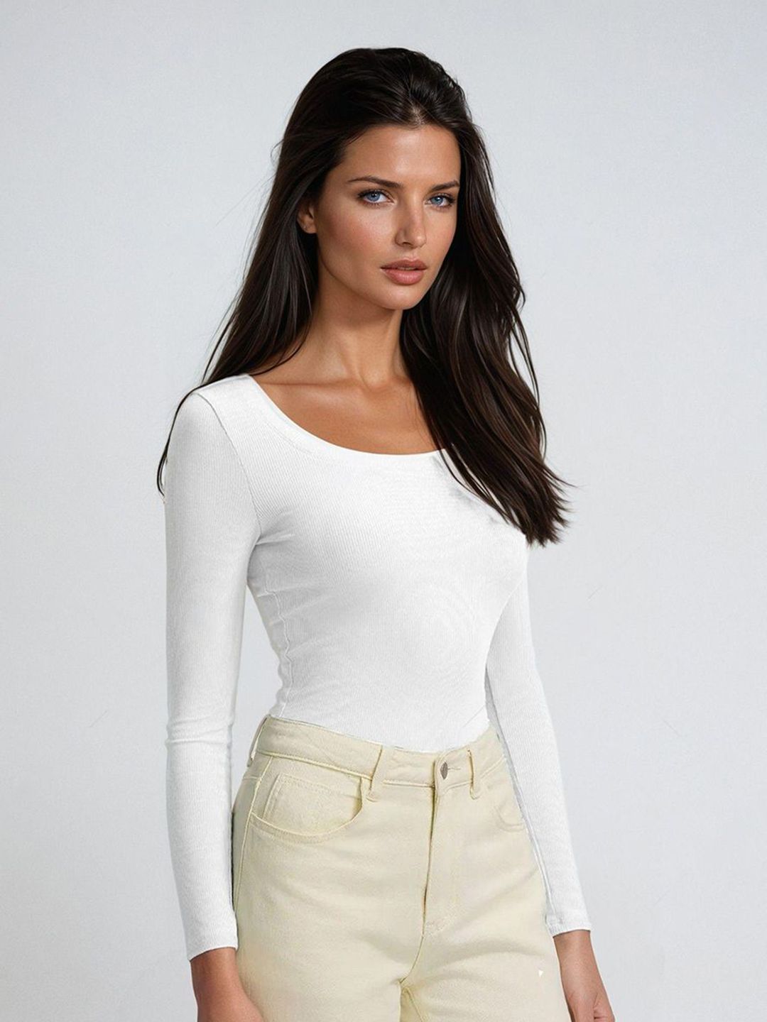 Product Details: White Top for womenSolidRegular lengthScoop neckLong sleevesKnitted || SIZE & FIT: FittedThe model (height 5.8') is wearing a size S || MATERIAL & CARE: Cotton BlendMachine Wash