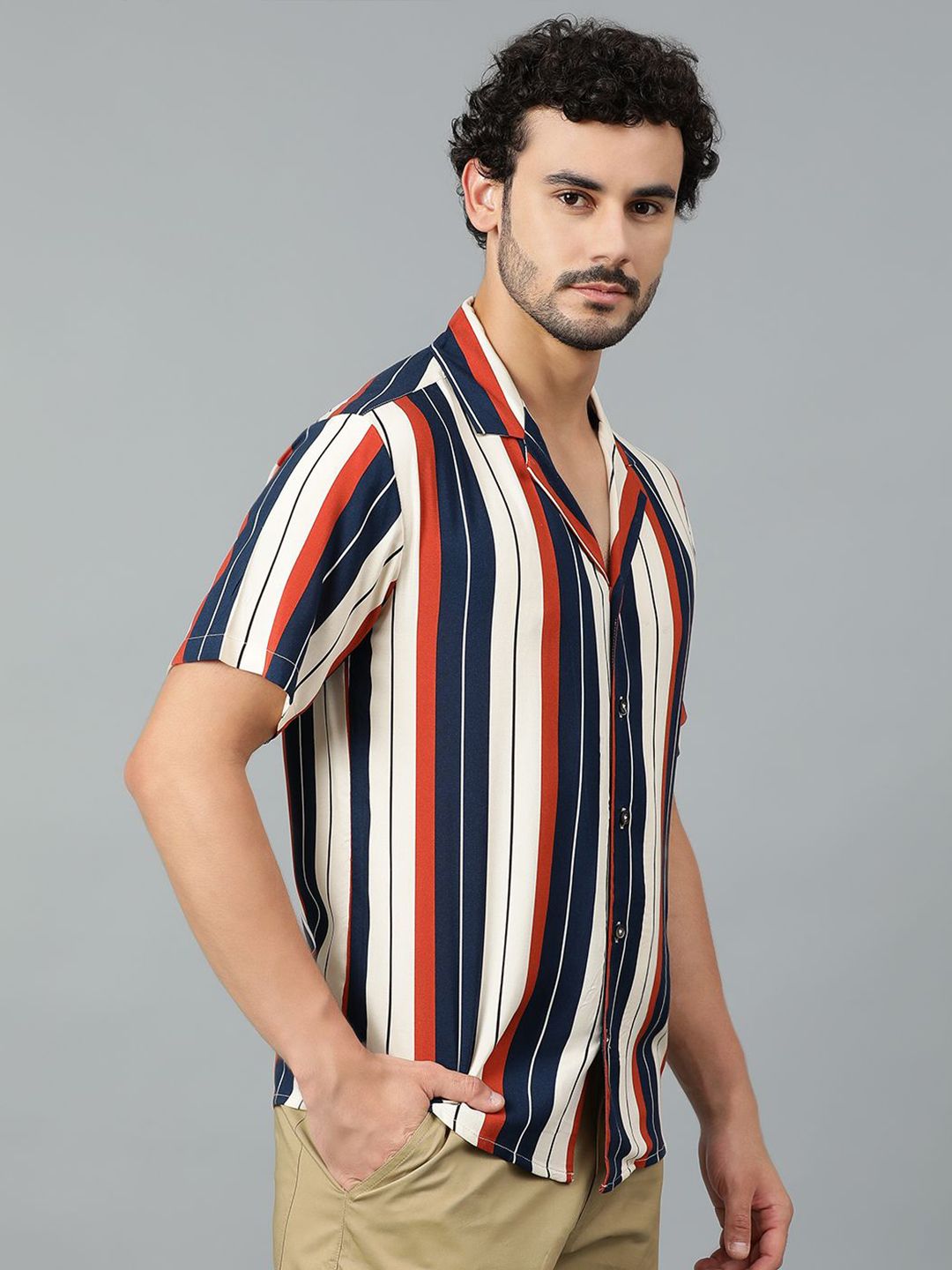 Product Details: Beige & navy blue shirt for men Striped Cuban collar Button placket Short, regular sleeves Curved hem || MATERIAL & CARE: Cotton blendMachine wash || SIZE & FIT: Regular FitThe model (height 6') is wearing a size 40