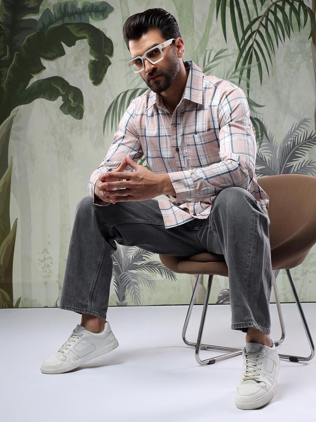 Kotty Men Spread Collar Tartan Checked Casual Shirt