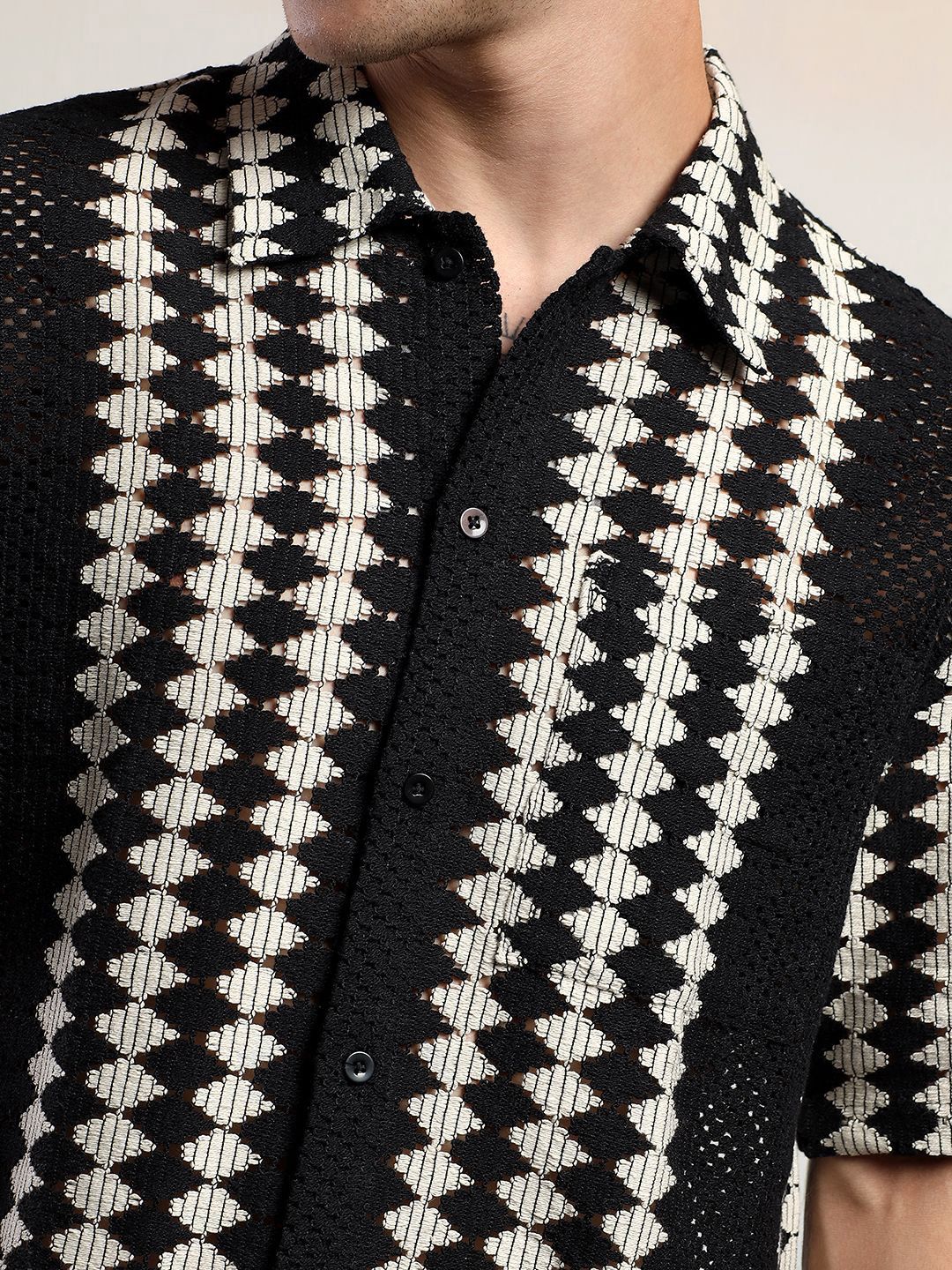 Product Details: Black, cream solid striped sheer casual shirt ,has a spread collar, button placket, na pocket, short regular sleeves, straight hem || MATERIAL & CARE: CottonMachine Wash || SIZE & FIT: Fit: Regular FitThe model (height 6') is wearing a size 40