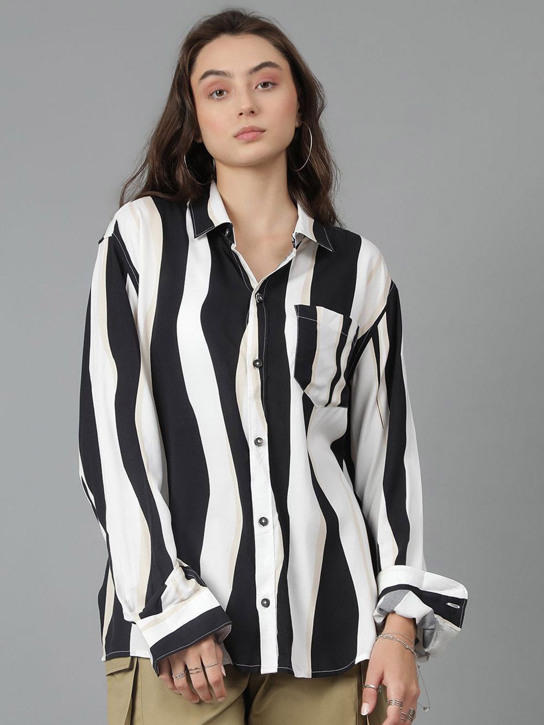 Kotty Women Spread Collar Striped Cotton Oversized Casual Shirt