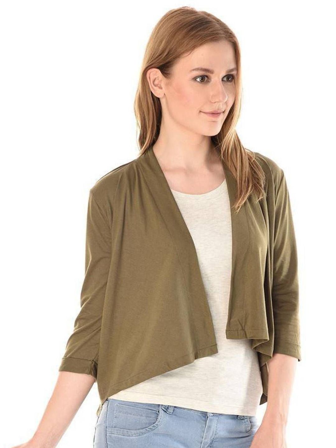 Product Details: Green solid open front crop shrug ,has three-quarter sleeves, straight hem || SIZE & FIT: The model (height 5'8) is wearing a size S || MATERIAL & CARE: PolycottonMachine Wash