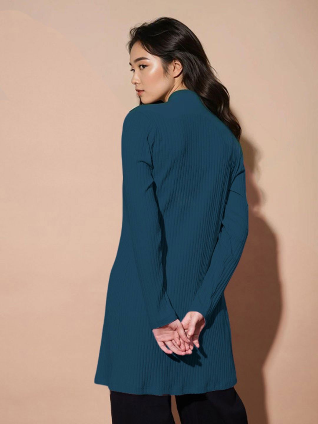 Product Details: Blue solid open front regular shrug ,has long sleeves, straight hem || SIZE & FIT: The model (height 5'8) is wearing a size S || MATERIAL & CARE: Cotton Blend Machine Wash