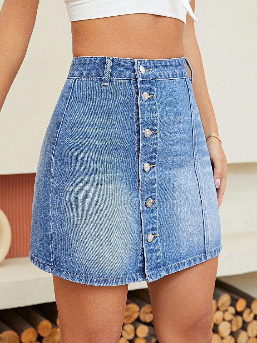 Product Details: Blue solid pencil above knee length skirt, has an elasticated waistband with button closure and straight hem || MATERIAL & CARE: Cotton Lycra BlendMachine wash || SIZE & FIT: The model (height 5'8") is wearing a size 26