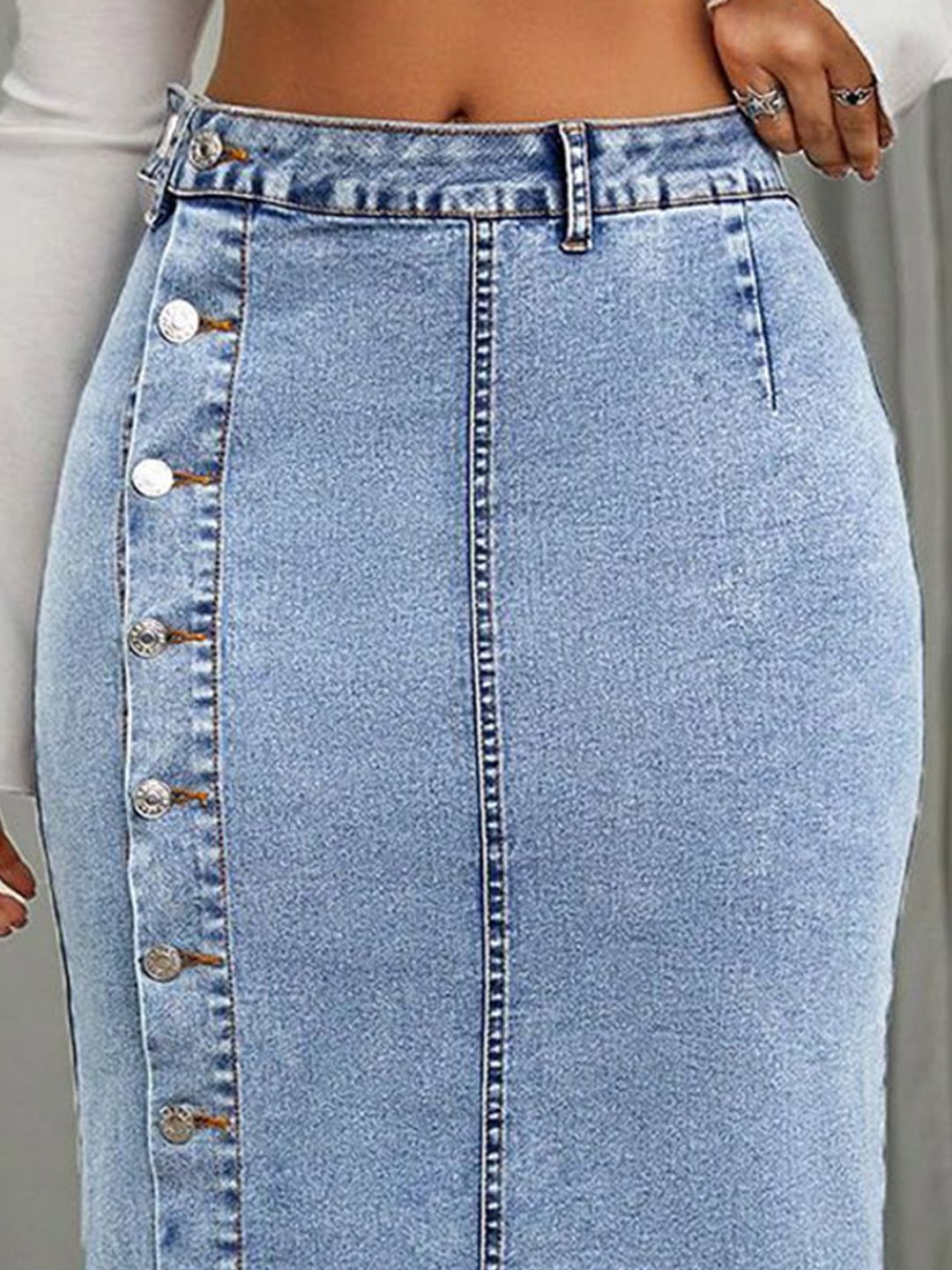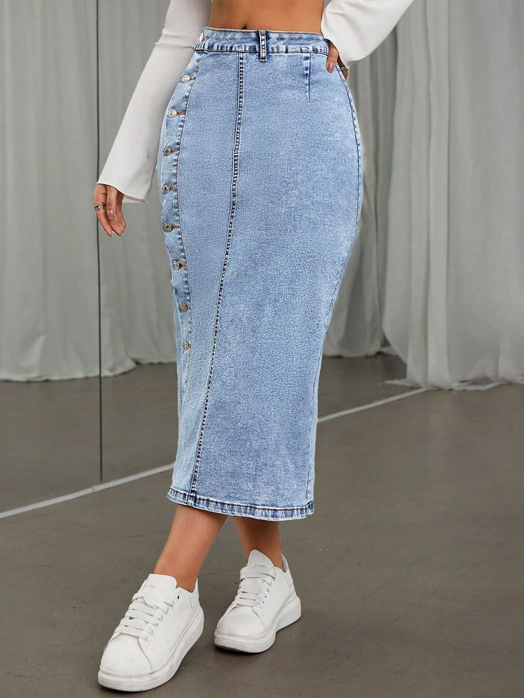 Product Details: Blue solid straight midi skirt, has an elasticated waistband with button closure, and a straight hem || SIZE & FIT: The model (height 5'8") is wearing size 32 || MATERIAL & CARE: Cotton Blend Machine Wash