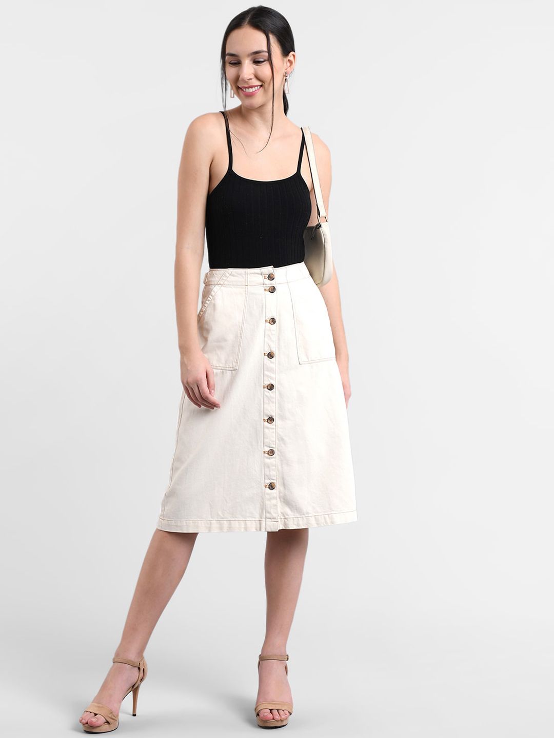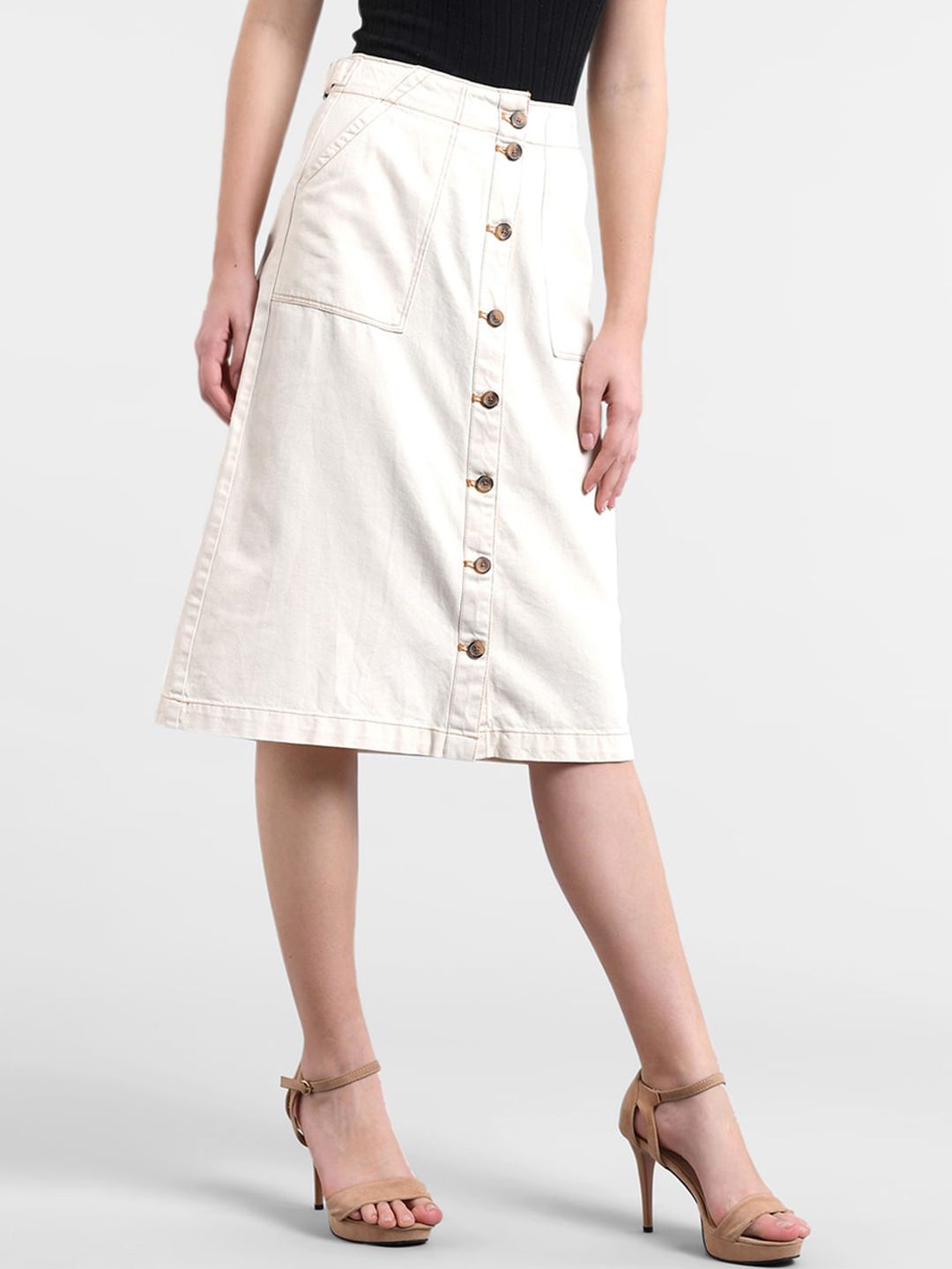 Kotty Women Cream-Coloured Solid Denim Denim A-Line Skirt