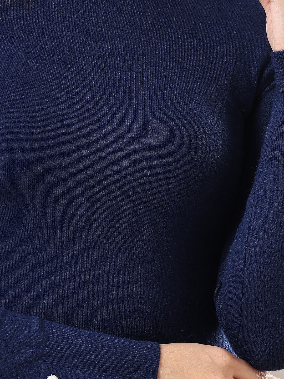Product Details: Blue solid pullover ,has a high neck, long sleeves, ribbed hem || MATERIAL & CARE: Cotton BlendMachine Wash || SIZE & FIT: The model (height 5'8) is wearing a size S