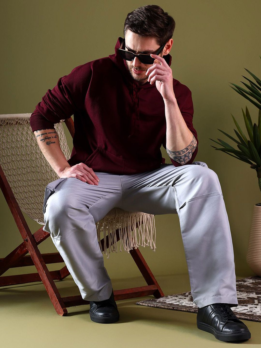 Product Details: Maroon solid sweatshirt has a hooded, 1 kangaroo pocket pockets, long sleeves, closure, ribbed hem || MATERIAL & CARE: Fleece Machine Wash || SIZE & FIT: The model (height 6') is wearing a size M