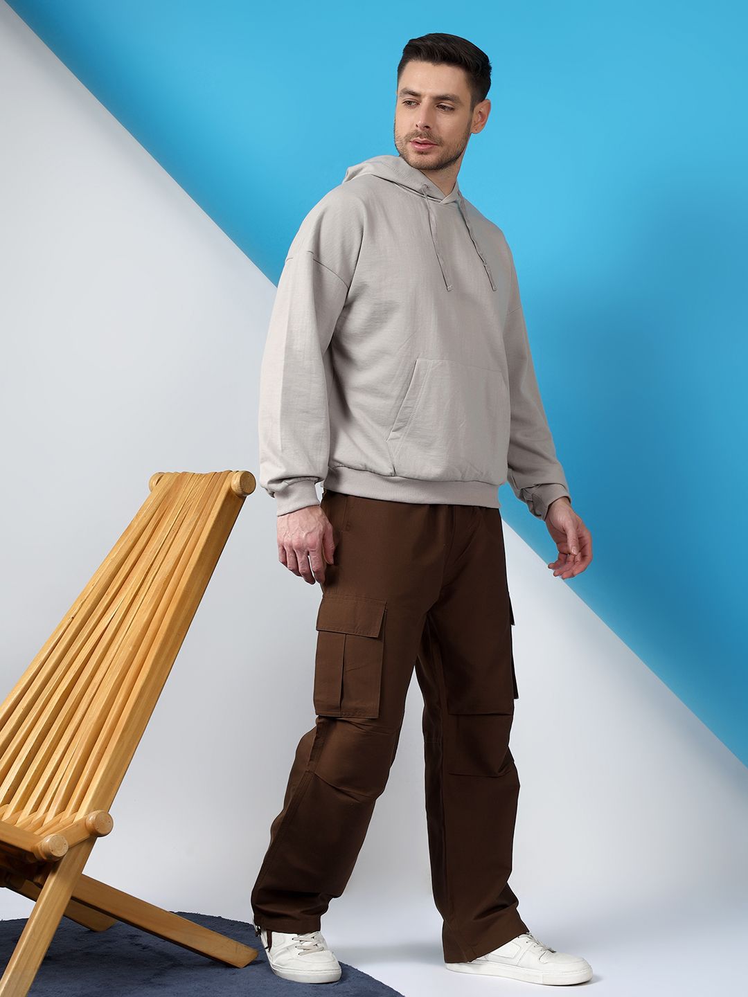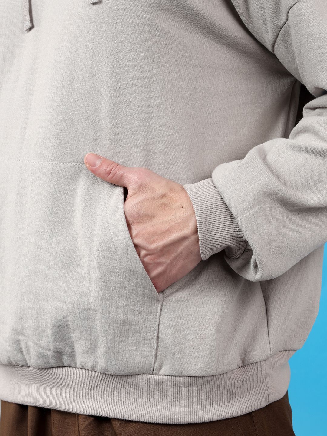 Product Details: Beige solid sweatshirt has a hooded, 1 kangaroo pocket pockets, long sleeves, closure, ribbed hem || SIZE & FIT: The model (height 6') is wearing a size M || MATERIAL & CARE: Fleece Machine Wash