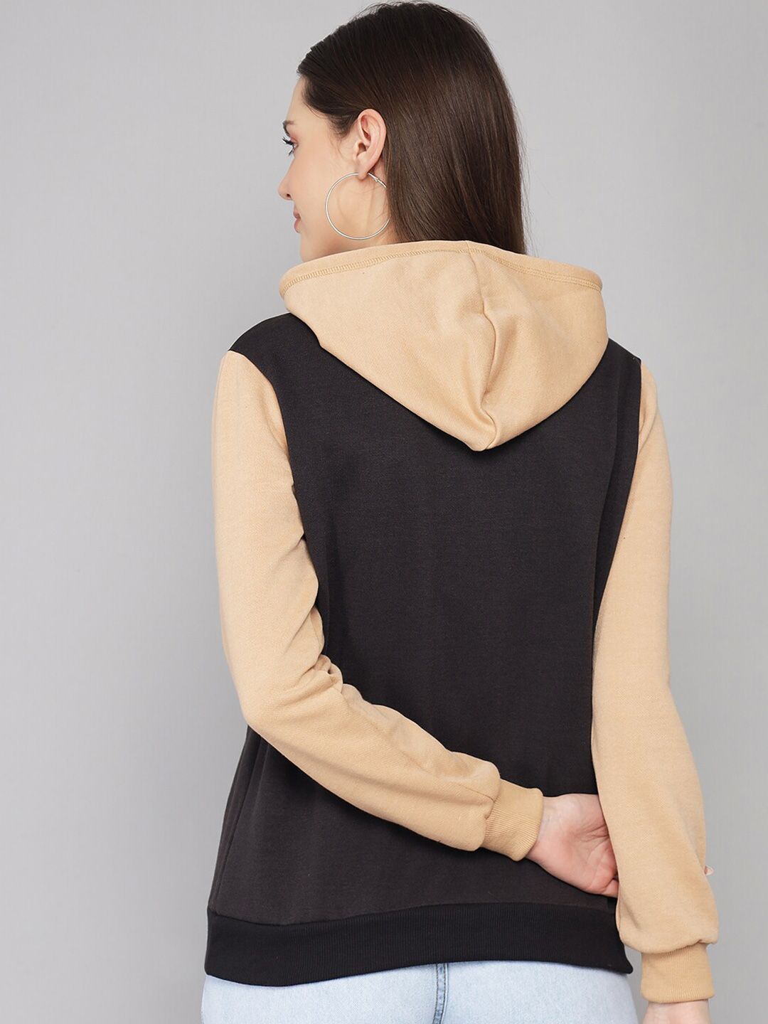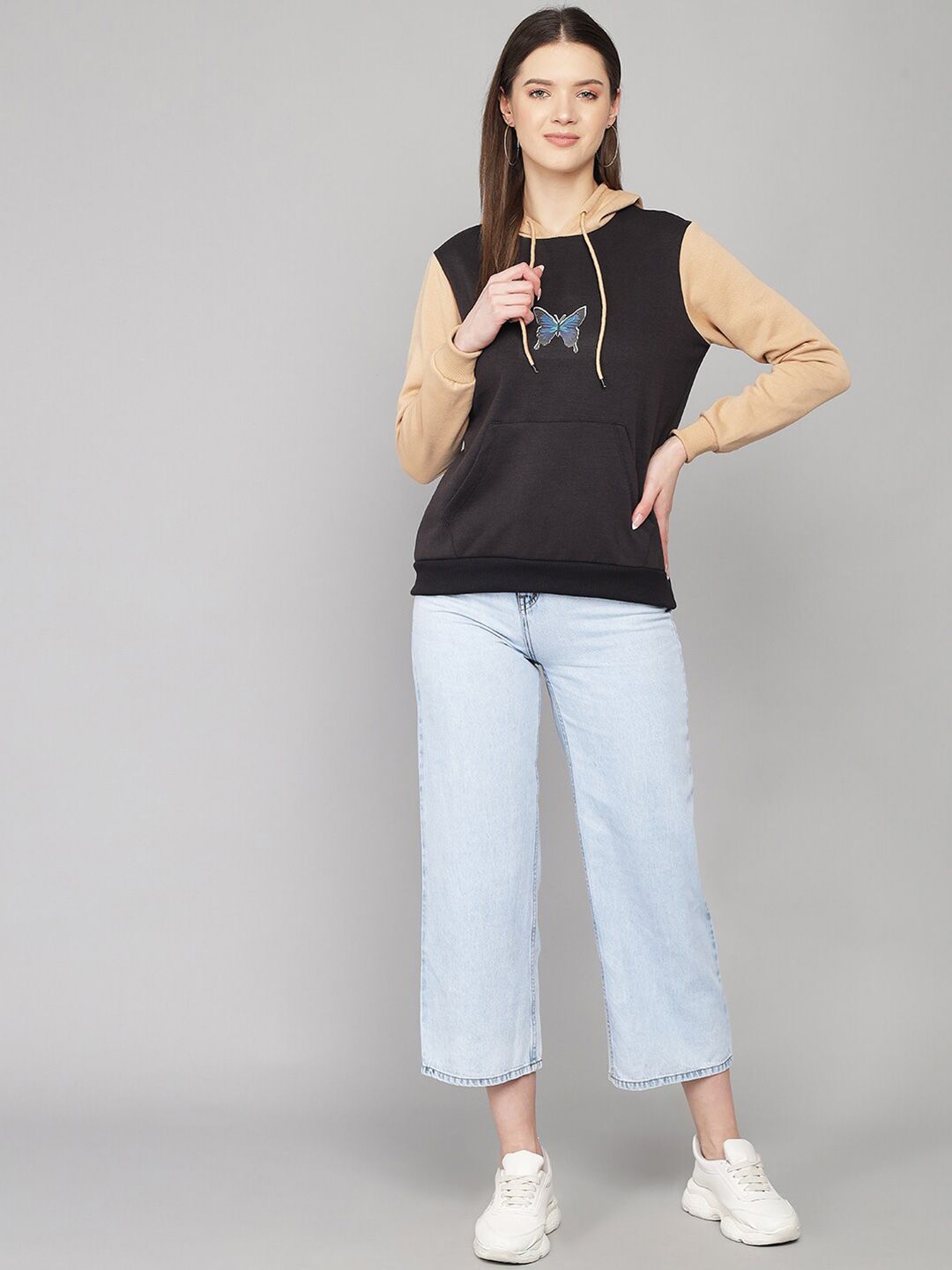 Product Details: Black printed sweatshirt has a hooded, 1 kangaroo pocket pockets, long sleeves, closure, straight hem || MATERIAL & CARE: 100% fleece,gentle machine wash || SIZE & FIT: The model (height 5'8) is wearing a size S