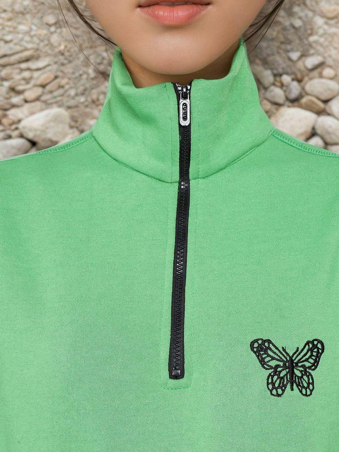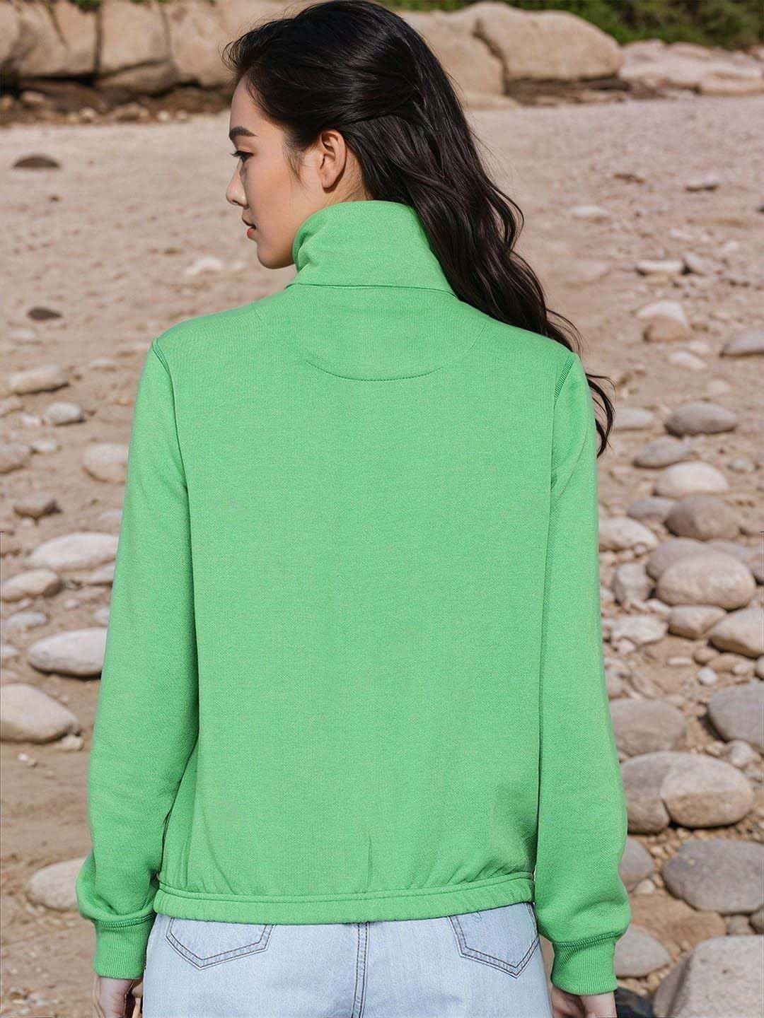 Product Details: Green graphic printed pullover sweatshirt has a high neck, 1 kangaroo pockets, long sleeves, half zipper closure, straight hem || SIZE & FIT: The model (height 5'8) is wearing a size S || MATERIAL & CARE: CottonMachine Wash