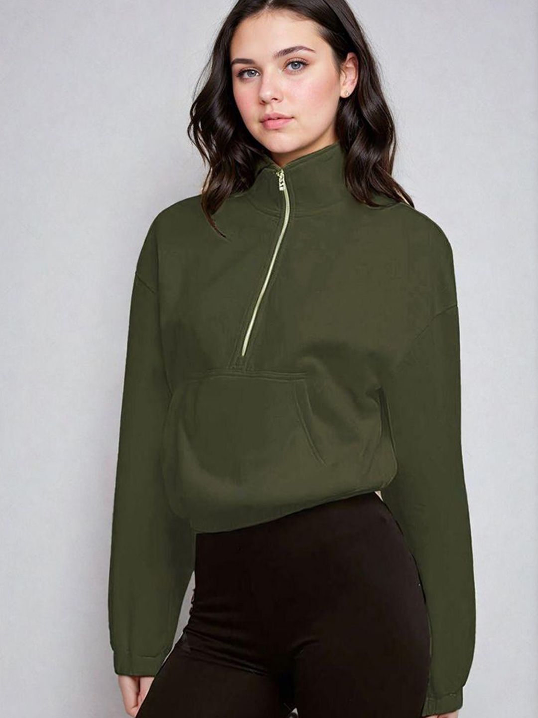 Product Details: Olive solid sweatshirt has a shirt collar, 2 kangaroo pocket , long sleeves, half zipper closure, straight hem || SIZE & FIT: The model (height 5'8) is wearing a size S || MATERIAL & CARE: FleeceMachine Wash