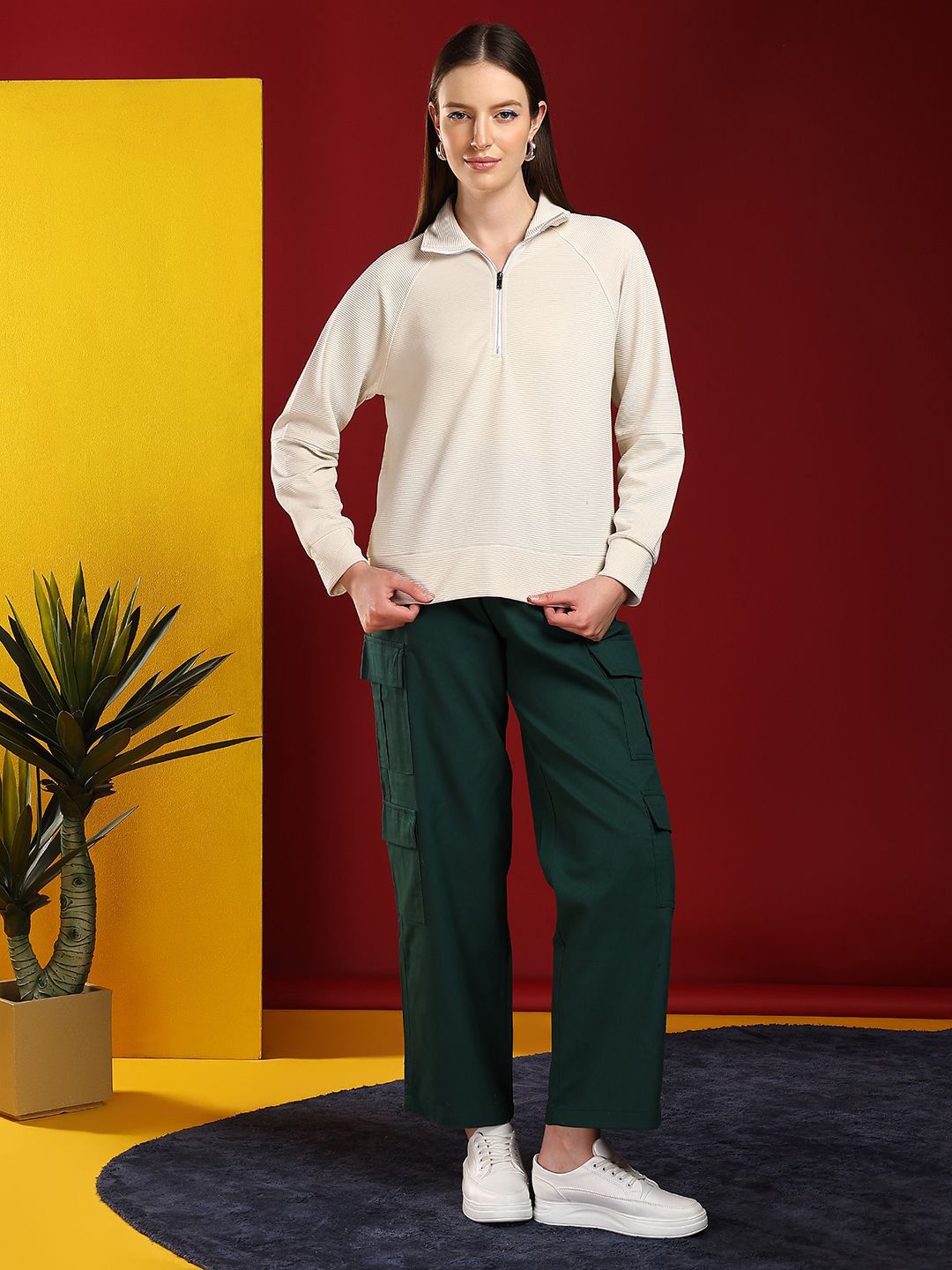 Product Details: Cream-coloured solid sweatshirt has a high neck, na pockets, long sleeves, half zipper closure, straight hem || SIZE & FIT: The model (height 5'8) is wearing a size S || MATERIAL & CARE: Rib, Machine wash