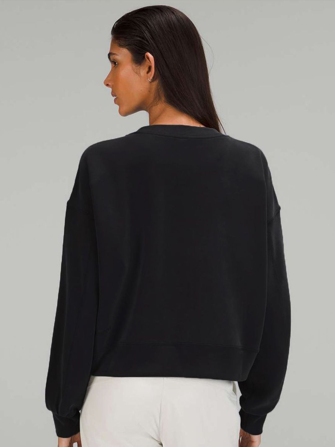 Product Details: Black printed sweatshirt has a round neck, na pockets, long sleeves, closure, straight hem || MATERIAL & CARE: FleeceMachine Wash || SIZE & FIT: The model (height 5'8) is wearing a size S