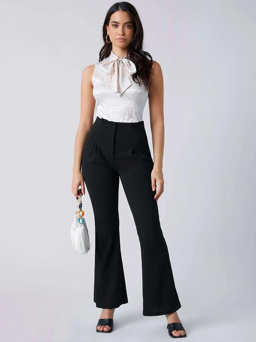 Product Details: White regular top Animal printed Tie-up neck, sleeveless Woven satin fabric Tie-ups closure || MATERIAL & CARE: SatinMachine Wash || SIZE & FIT: The model (height 5'8) is wearing a size S