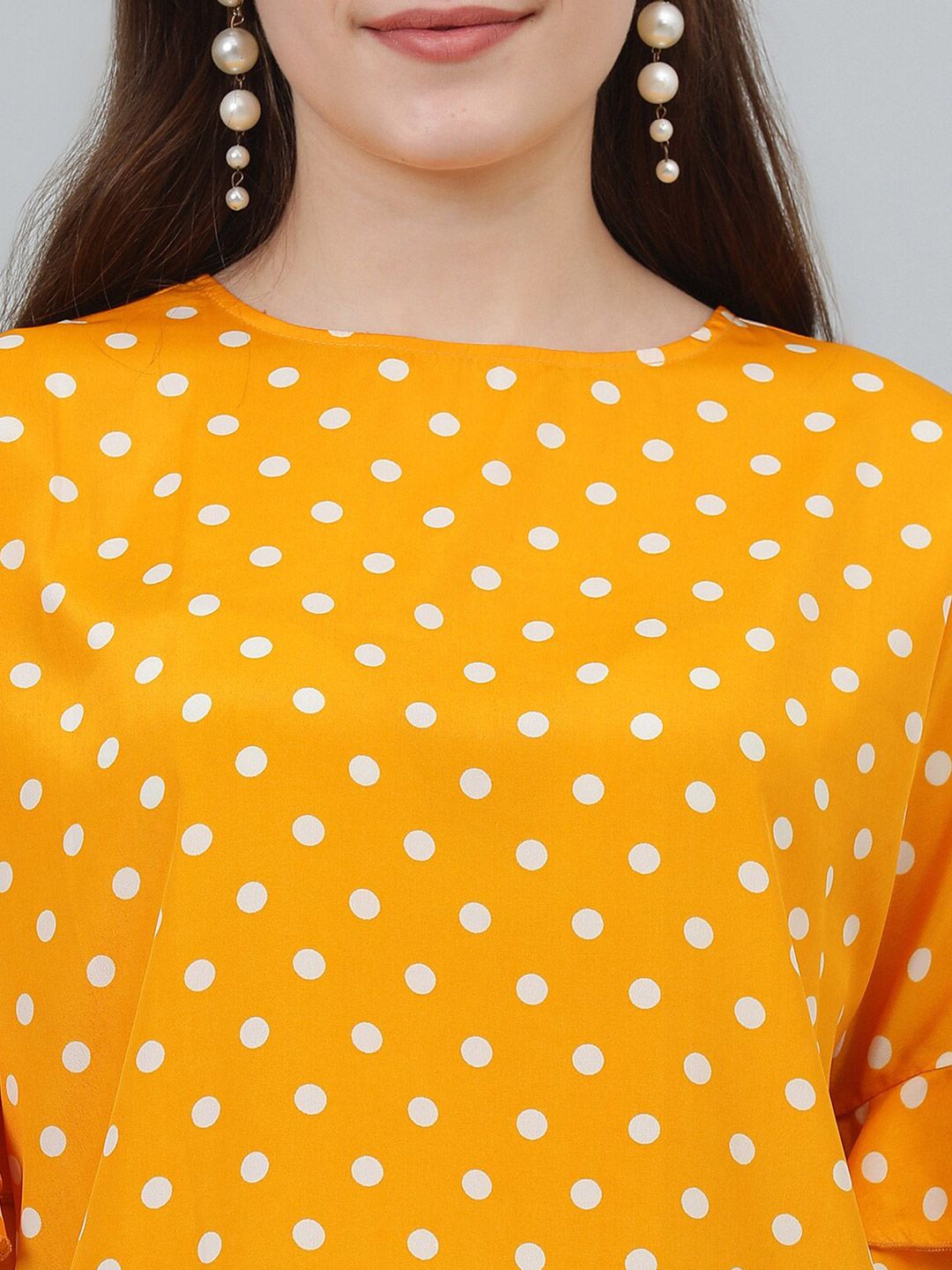 Product Details: Yellow and white regular top Polka dot print Round neck, short, flared sleeves Woven satin Button closure || MATERIAL & CARE: SatinMachine wash || SIZE & FIT: The model (height 5'8) is wearing a size S