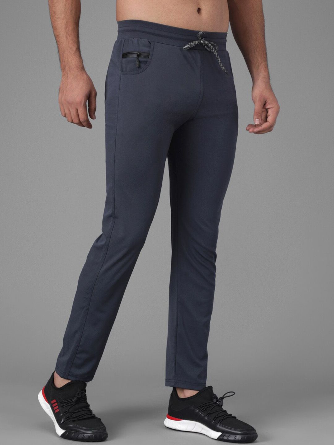 Product Details: Navy blue solid track pants, has an elasticated waistband with drawstring closure, and three pockets || SIZE & FIT: The model (height 6') is wearing a size M || MATERIAL & CARE: CottonMachine Wash