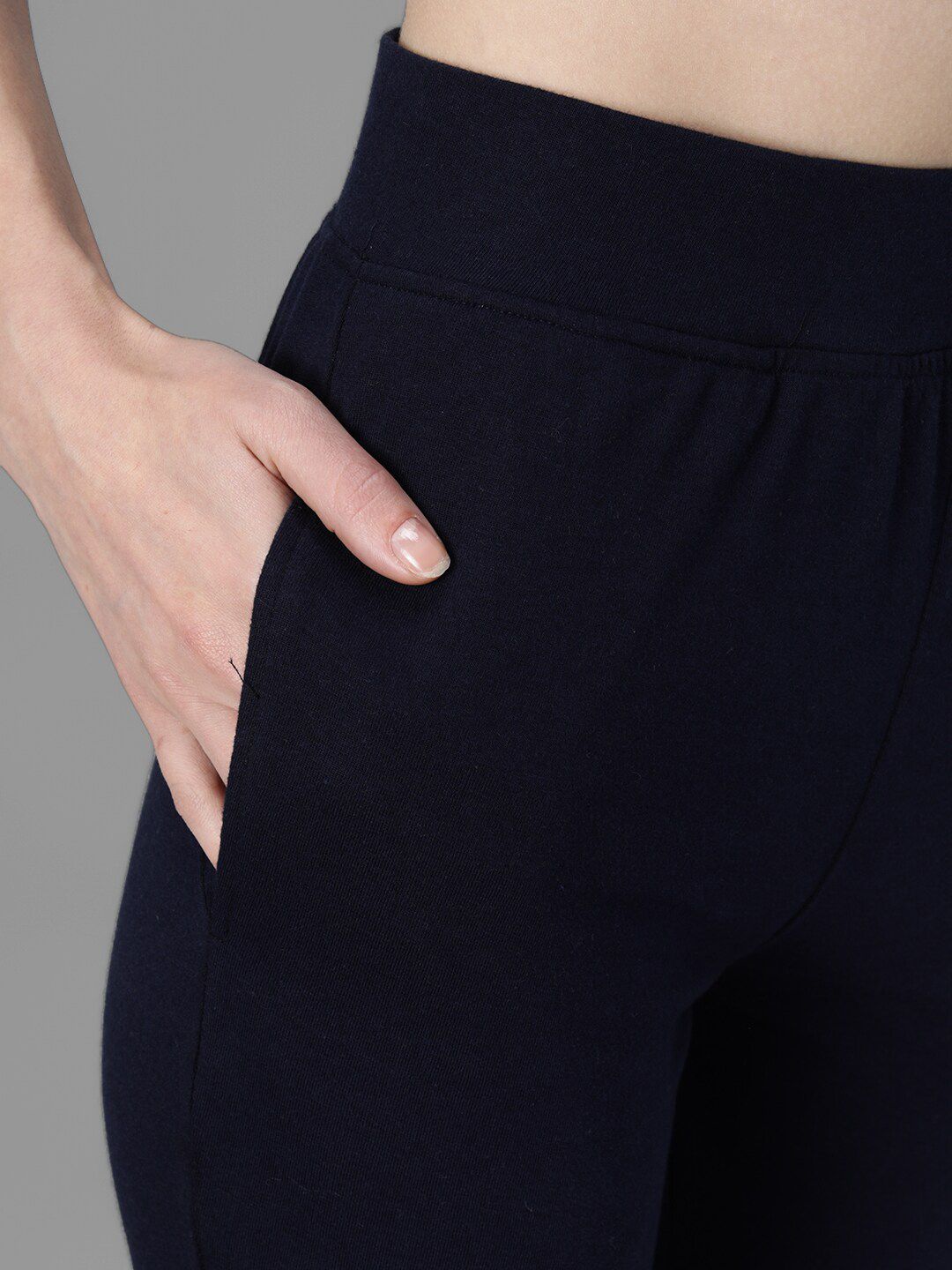 Product Details: A pair of navy blue & white joggers, has an elasticated waistband with slip-on closure, two side pockets, cuffed hem and a white typography print on one side || MATERIAL & CARE: CottonHand-wash || SIZE & FIT: The model (height 5'8") is wearing a size S