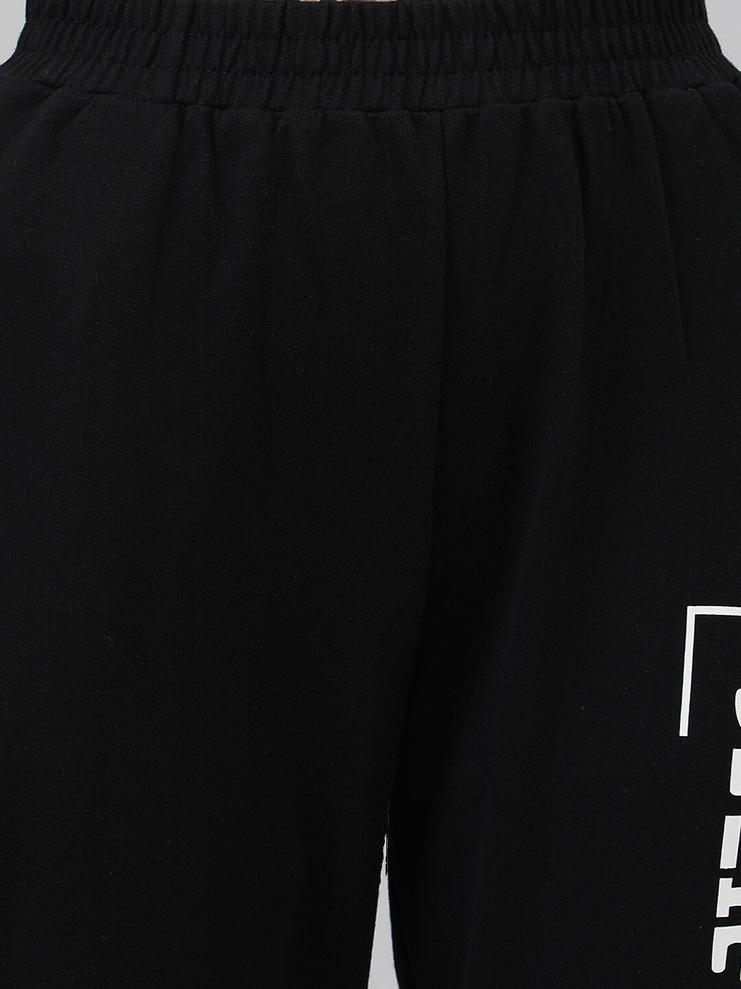 Product Details: Black and white solid with side printed relaxed-fit mid-rise joggers with brand name detailed, has an elasticated waistband with slip-on closure and two pocket and cuffed hem || MATERIAL & CARE: CottonMachine Wash || SIZE & FIT: Relaxed-FitThe model (height 5'8") is wearing a size XS