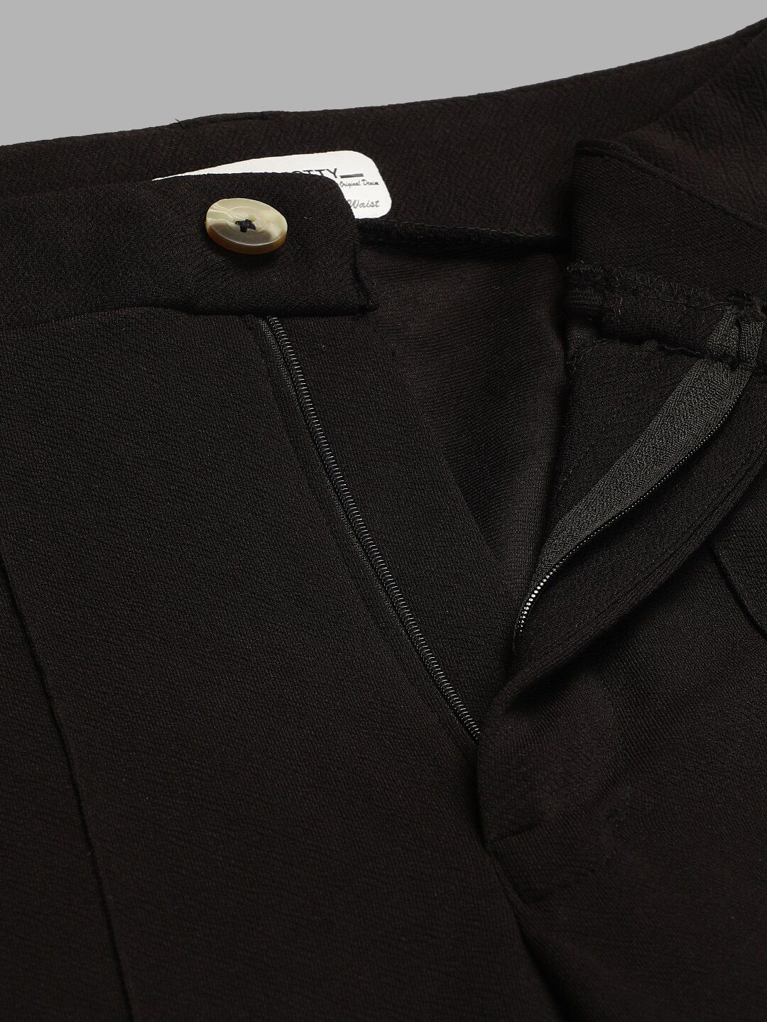 Product Details: Black woven trousers Straight fit Brand Fit: relaxed High-rise Length: regular Pattern: solid Flat-front, with no pleats design Feature: easy wash || MATERIAL & CARE: Polyester BlendMachine Wash || SIZE & FIT: Brand Fit: Relaxed Fit: Straight Fit The model (height 5'8) is wearing a size 28