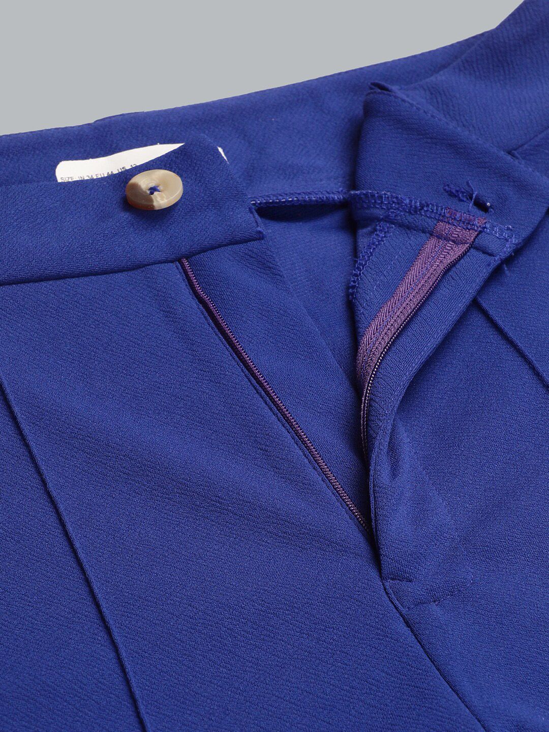 Product Details: Blue woven trousers Straight fit Brand Fit: relaxed High-rise Length: regular Pattern: solid Flat-front, with no pleats design Feature: easy wash Na pockets || MATERIAL & CARE: Polyester BlendMachine Wash || SIZE & FIT: Brand Fit: Relaxed Fit: Straight Fit The model (height 5'8) is wearing a size 28