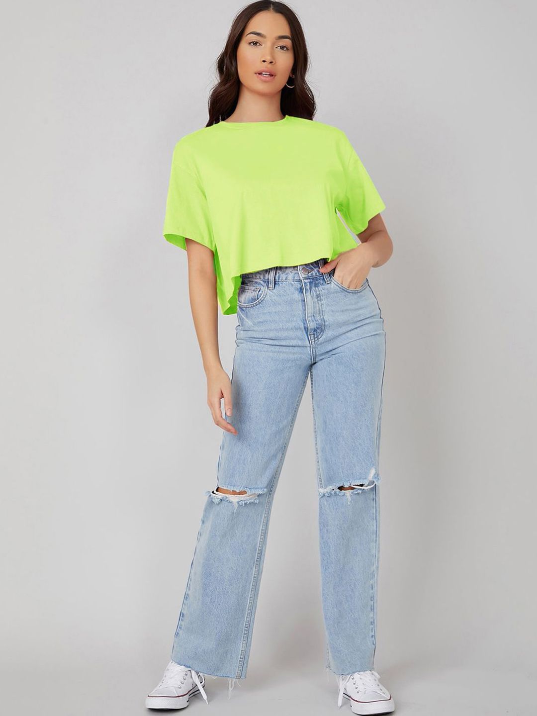 Product Details: Green tshirt for women Solid Crop length Round neck Short, drop-shoulder sleeves Knitted cotton fabric || SIZE & FIT: Oversized The model (height 5'8) is wearing a size S || MATERIAL & CARE: Cotton blendMachine wash