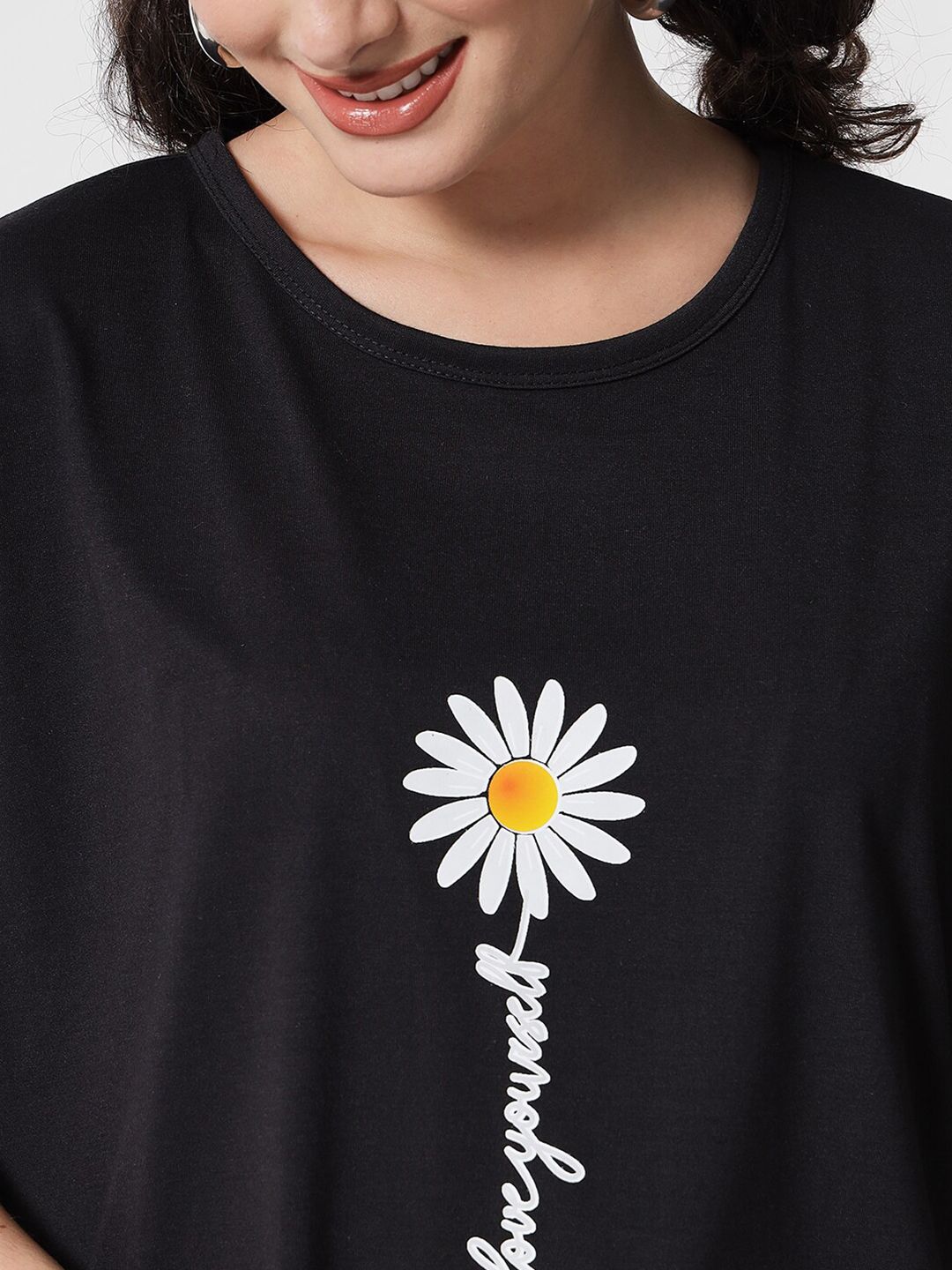 Kotty Women Black Typography Printed Drop-Shoulder Sleeves Applique Oversized T-shirt