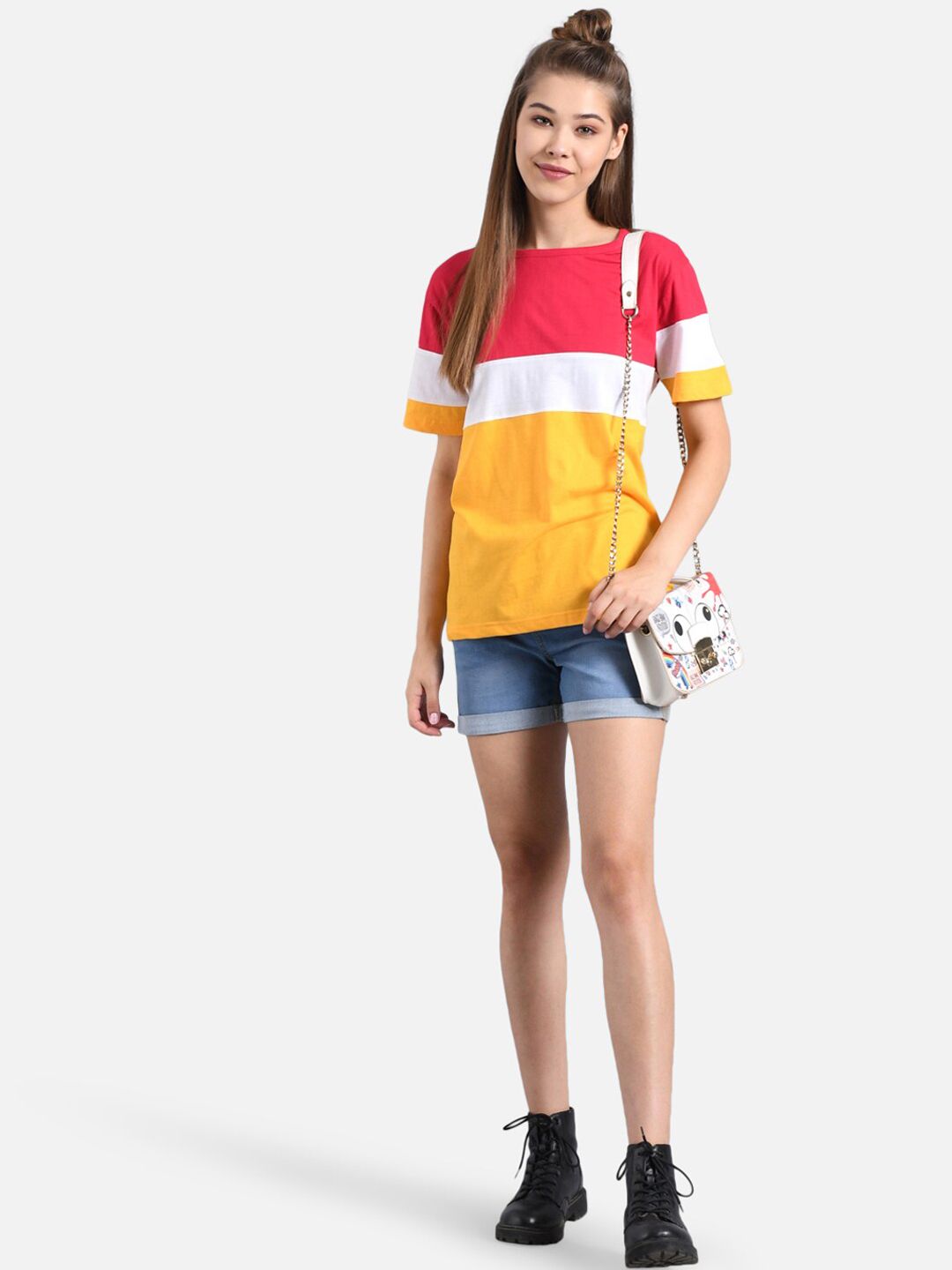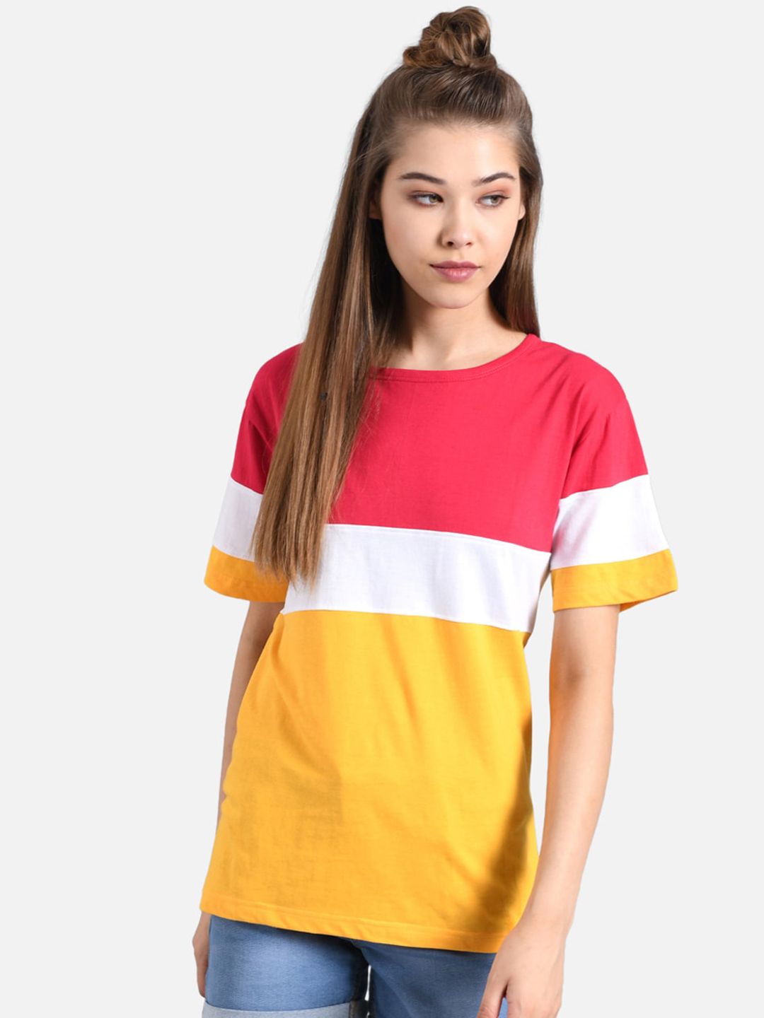 Kotty Women Peach-Coloured & White Colourblocked Round Neck T-shirt