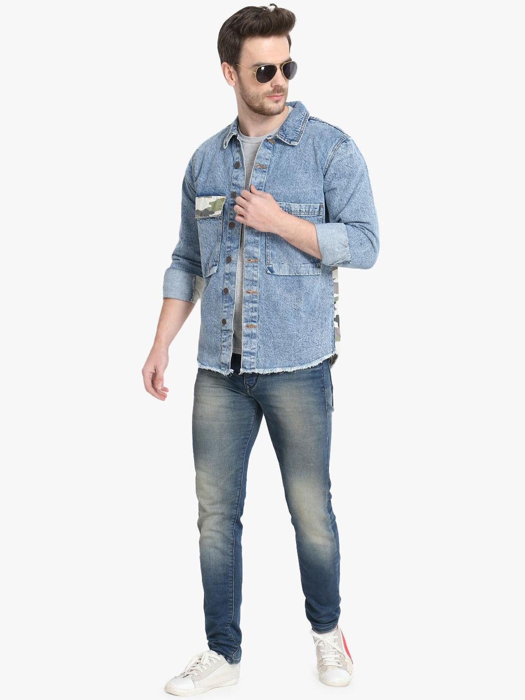 Product Details: Blue printed denim jacket, has a spread collar, button closure, curved hem, two pockets || MATERIAL & CARE: Material: CottonMachine wash || SIZE & FIT: The model (height 6') is wearing a size M