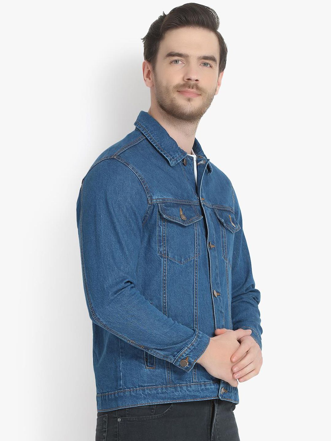 Product Details: Blue solid jacket, has a spread collar, button closure, straight hem, and i lining || MATERIAL & CARE: Material: Cotton || SIZE & FIT: The model (height 6') is wearing a size M
